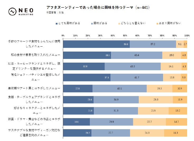 先の設問で、女性は「限定メニューやコラボメニューの有無」を重視する傾向があることをご紹介しました。そこでテーマのあるアフタヌーンティーについて、女性を対象に聞いたところ、「とても興味がある」「興味がある」の合計は全体的に高い割合を示す結果となりました。