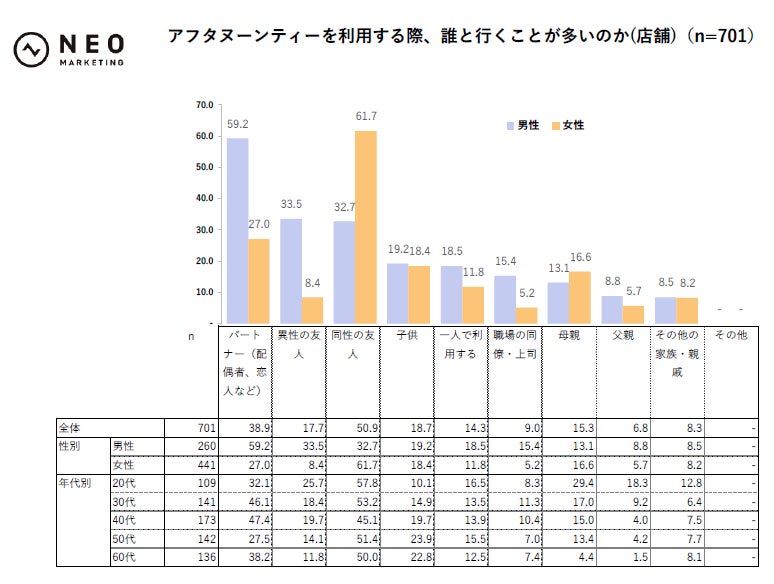 アフタヌーンティーを利用する際に一緒に行く人について聞いたところ、男性は「パートナー」が59.2%と圧倒的に多く、女性は「同性の友人」が61.7%と高い傾向が見られ、男女で利用する目的が異なっていることがわかりました。男性は、「パートナー」との特別で贅沢な空間として利用しており、女性は女子会で友達と楽しい時間を過ごすための非日常的な時間を楽しむ目的で利用しているのかもしれません。