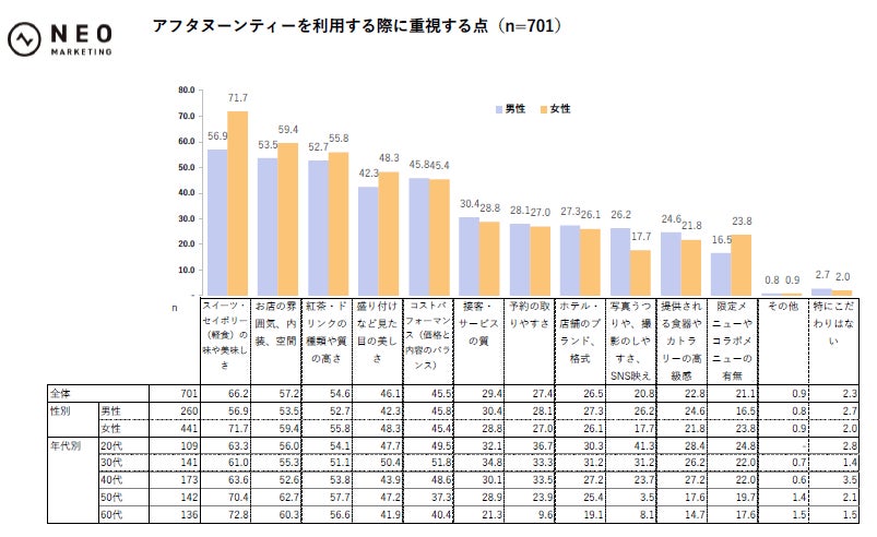 「スイーツ・セイボリー(軽食)の味や美味しさ」は男女共通して最も重視していることがわかりました。しかし男性は「スイーツ・セイボリー(軽食)の味や美味しさ」が、「お店の雰囲気、内装、空間」や「紅茶・ドリンクの種類や質の高さ」と同程度のレベルだったのに対して、女性は「スイーツ・セイボリー(軽食)の味や美味しさ」が他の項目よりもとくに高く、とくに重要視していることがわかりました。また女性は男性よりも「限定メニューやコラボメニューの有無」を重視する傾向が見られました。