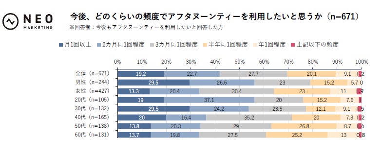 今後、どのくらいの頻度でアフタヌーンティーを利用したいか聞いたところ、男性が「月1回以上」で29.5%と高く、頻度が伸びるごとに徐々に下がっていき、女性は「3カ月に1回程度」が30.4%と高い結果となりました。