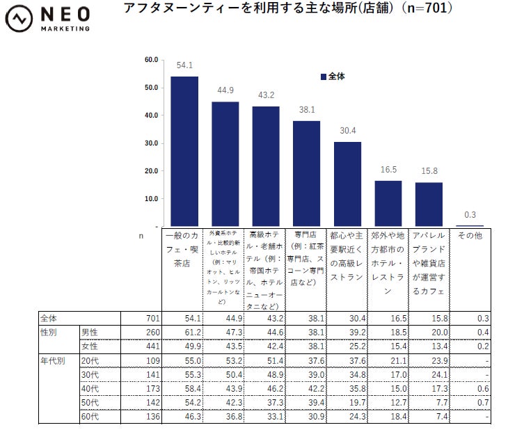 近年、若年層にも広がりを見せる「アフタヌーンティー」の利用実態(頻度、場所、同行者、動機、情報源など)を701人に調査。「アフタヌーンティー」に関する利用実態調査結果全データ公開