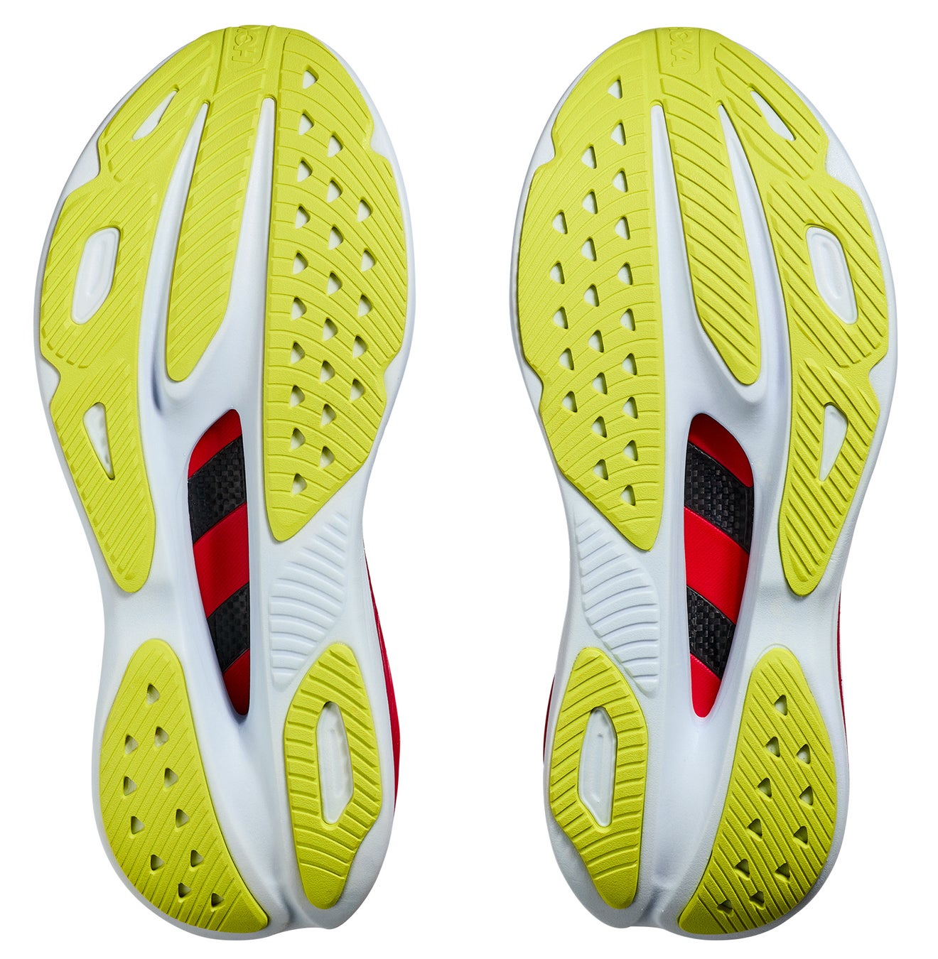 「SKYWARD X」は、ブランドの核であるクッション性に革新的なカーボンファイバー製プレートシステムを融合させ、究極のクッション性と反発性と安定性を備え、ダイナミックでより楽な走りを提供する新モデルです。一歩踏み出すたびに反発力を生む画期的なサスペンションシステムや、推進力の高い凸型のカーボンファイバープレートを搭載しています。ソールの足に最も近い位置にソフトで反発性の高いPEBAフォームを配し、高い安定性のスーパークリティカルフォーム EVAにより衝撃の少ない軽快で楽な走り心地を可能にしました。