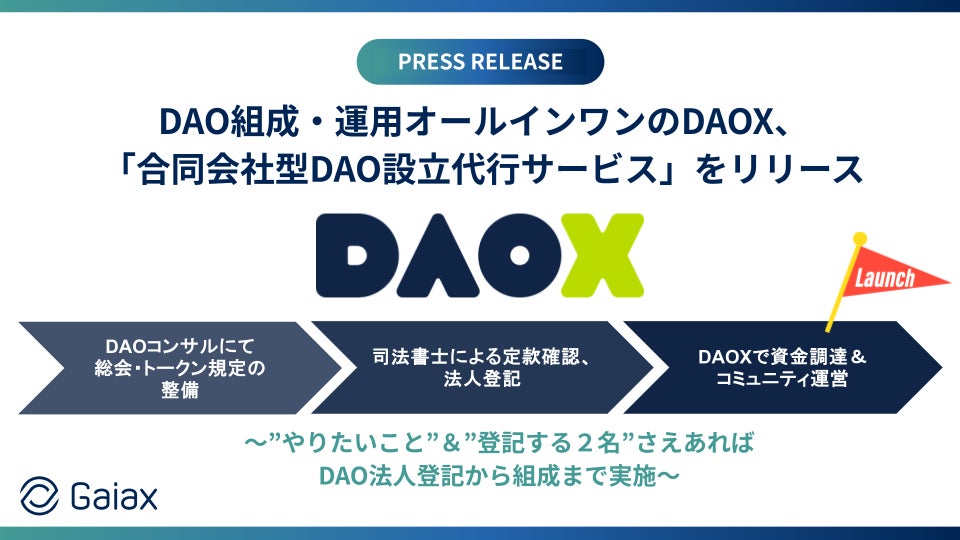株式会社ガイアックス(本社:東京都千代田区、代表執行役社長:上田 祐司、証券コード:3775、以下 ガイアックス)が提供する、DAO(※1)組成・運用プラットフォーム「DAOX(ダオエックス)」は、「合同会社型DAO設立代行サービス」をリリースします。