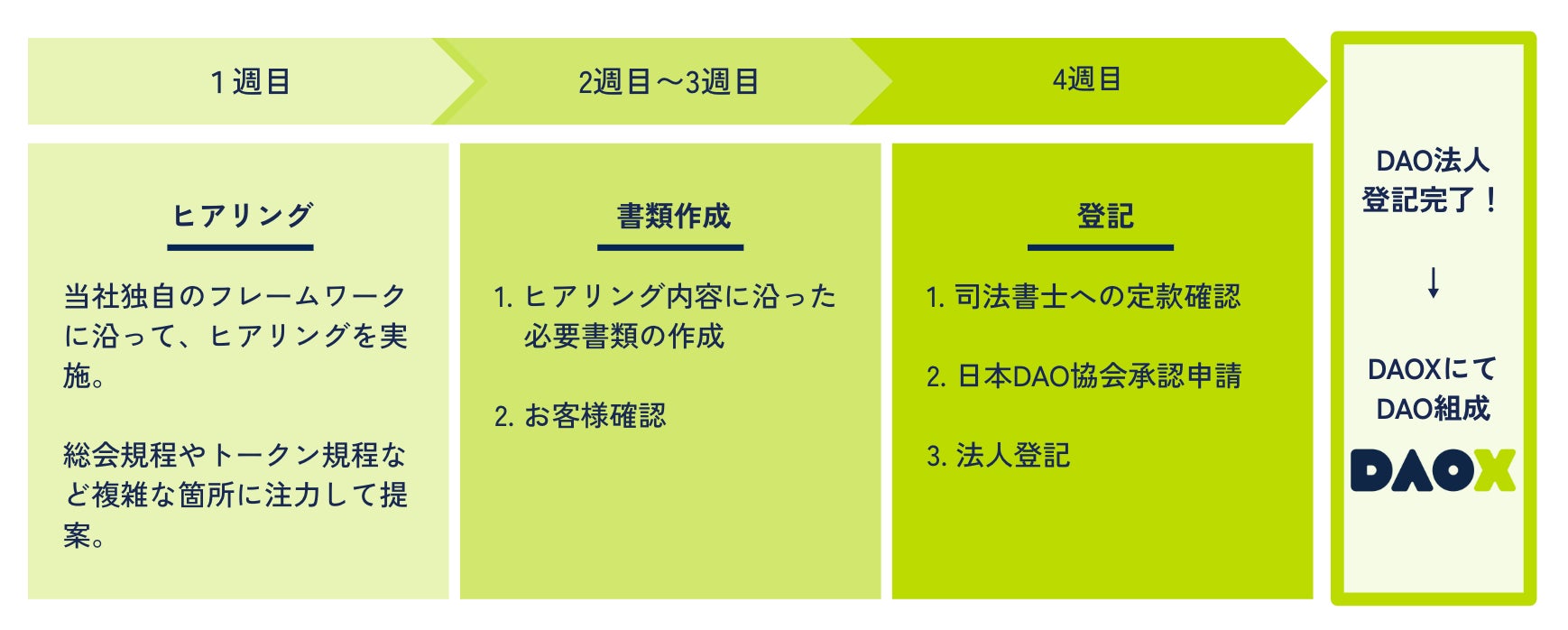この度、合同会社型DAOの設立実績を持つ寺本司法書士事務所(※2)との業務提携により、「DAOでやりたいこと」と「登記する2名」さえあれば、合同会社型DAOの登記からDAO組成までを一気通貫で提供可能となりました。なお、この一気通貫での提供は日本初の取り組みです。(※3)
