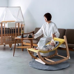 「ファルスカ クリエイティブコットLong」¥85,800、「ファルスカ クリエイティブコット」¥68,200、「ファルスカ コンパクトベッドFree」メランジブラウン/メランジグレー¥31,900、「ファルスカ スクロールチェアOne」ストーングレー/ミモザイエロー/ココアブラウン¥45,650