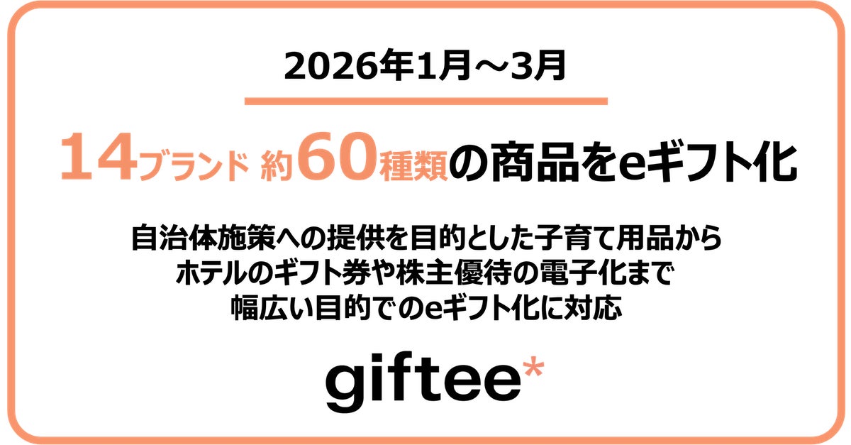 eギフトプラットフォーム事業(※1)を展開する株式会社ギフティ(本社:東京都品川区/代表取締役:太田 睦、鈴木 達哉/以下、ギフティ)は、2026年1月〜3月の期間に、新たに14ブランド約60種類の商品をeギフト化し、ギフティが運営するWEBサービスおよびスマートフォン向けアプリ「giftee®︎」(※2)、eギフトを活用した法人および自治体向けサービス「giftee for Business」(※3)、各ブランドの販売ページにて販売を開始いたしましたのでお知らせします。