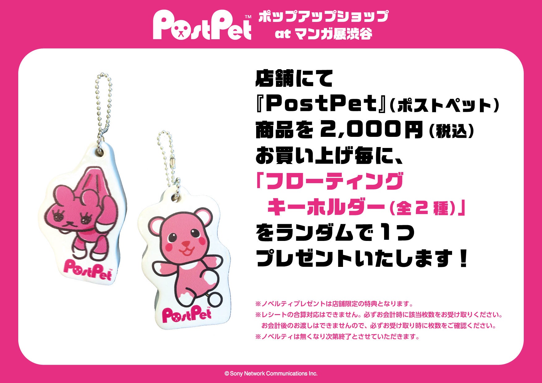 マンガ展 渋谷にて『PostPet』(ポストペット)商品を2,000円(税込)お買い上げ毎に、「フローティングキーホルダー(全2種)」をランダムで1つプレゼントいたします!