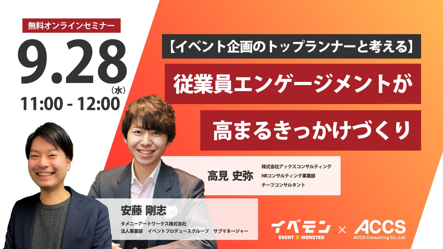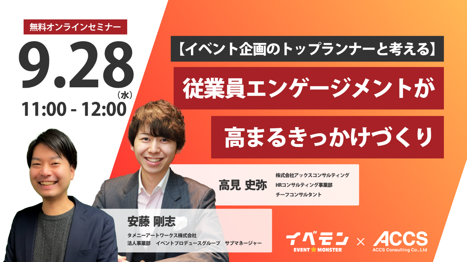 タメニー株式会社(本社:東京都品川区、代表取締役社長:佐藤茂、証券コード:東証グロース6181)のグループ会社であるタメニーアートワークス株式会社(代表取締役社長:福井秀幸)が運営する企業イベントプロデュース「イベモン(URL:https://evemon.jp/、以下「イベモン」)」は、コンサルティングサービスを行う株式会社アックスコンサルティング(本社:東京都渋谷区、代表取締役:広瀬元義)と共同で、9月28日(水)、「イベント企画のトップランナーと考える。従業員エンゲージメントが高まるきっかけづくり」をテーマとした無料ウェビナーを開催いたしますのでお知らせいたします。