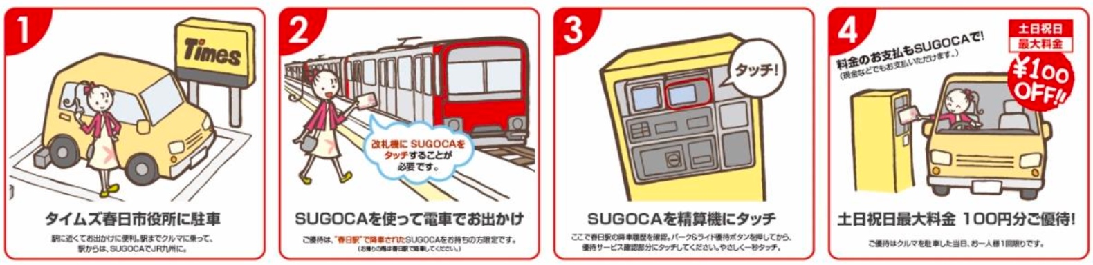 タイムズパーキングで精算される際に、精算当日に「春日駅」下車時に利用の「SUGOCA」を精算機にタッチいただくことで、カード内に記録された鉄道の利用履歴に応じて、自動で駐車料金が優待されるものです。「タイムズ春日市役所駐車場」では、土日祝日限定で駐車料金から100円が優待されます。