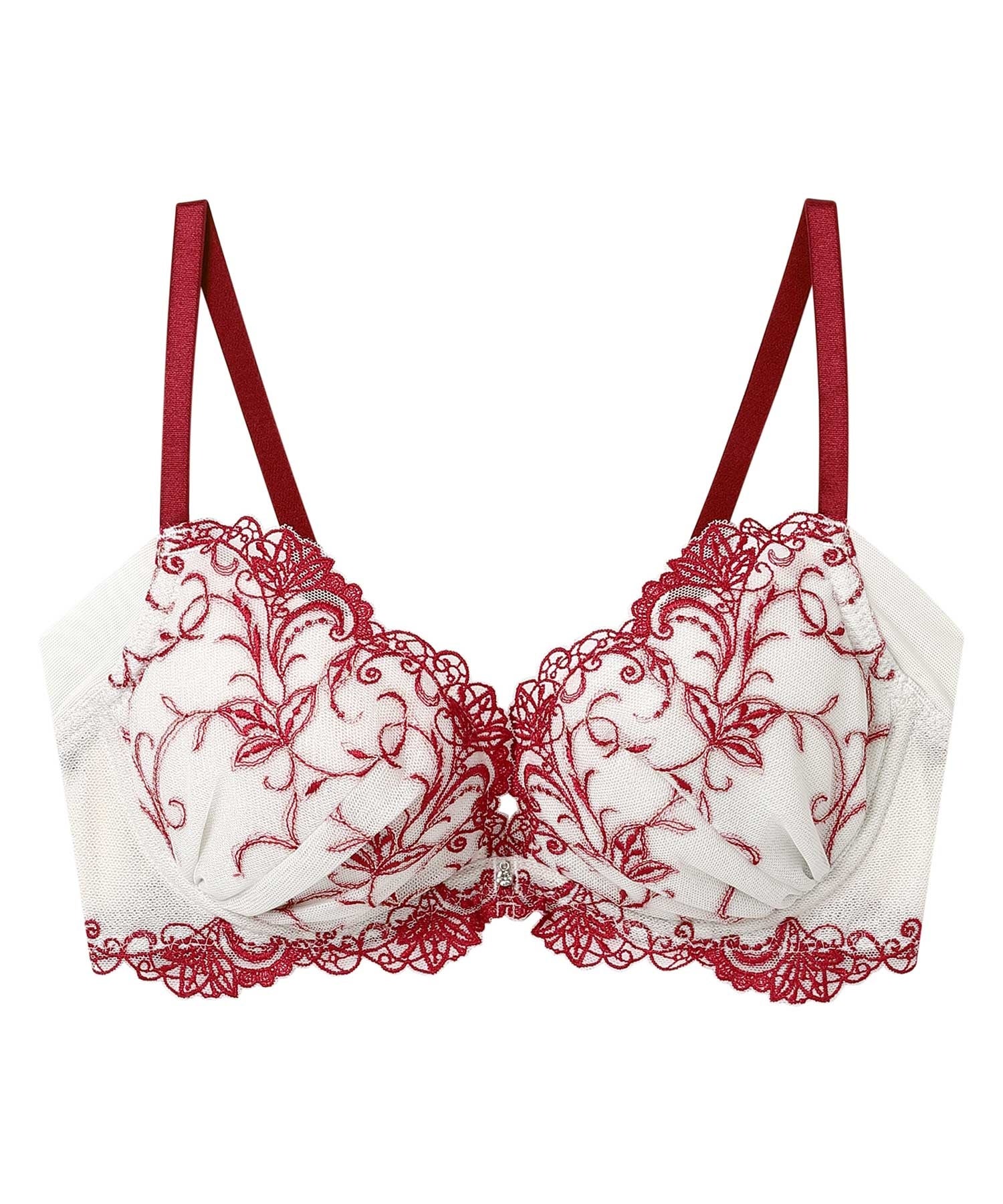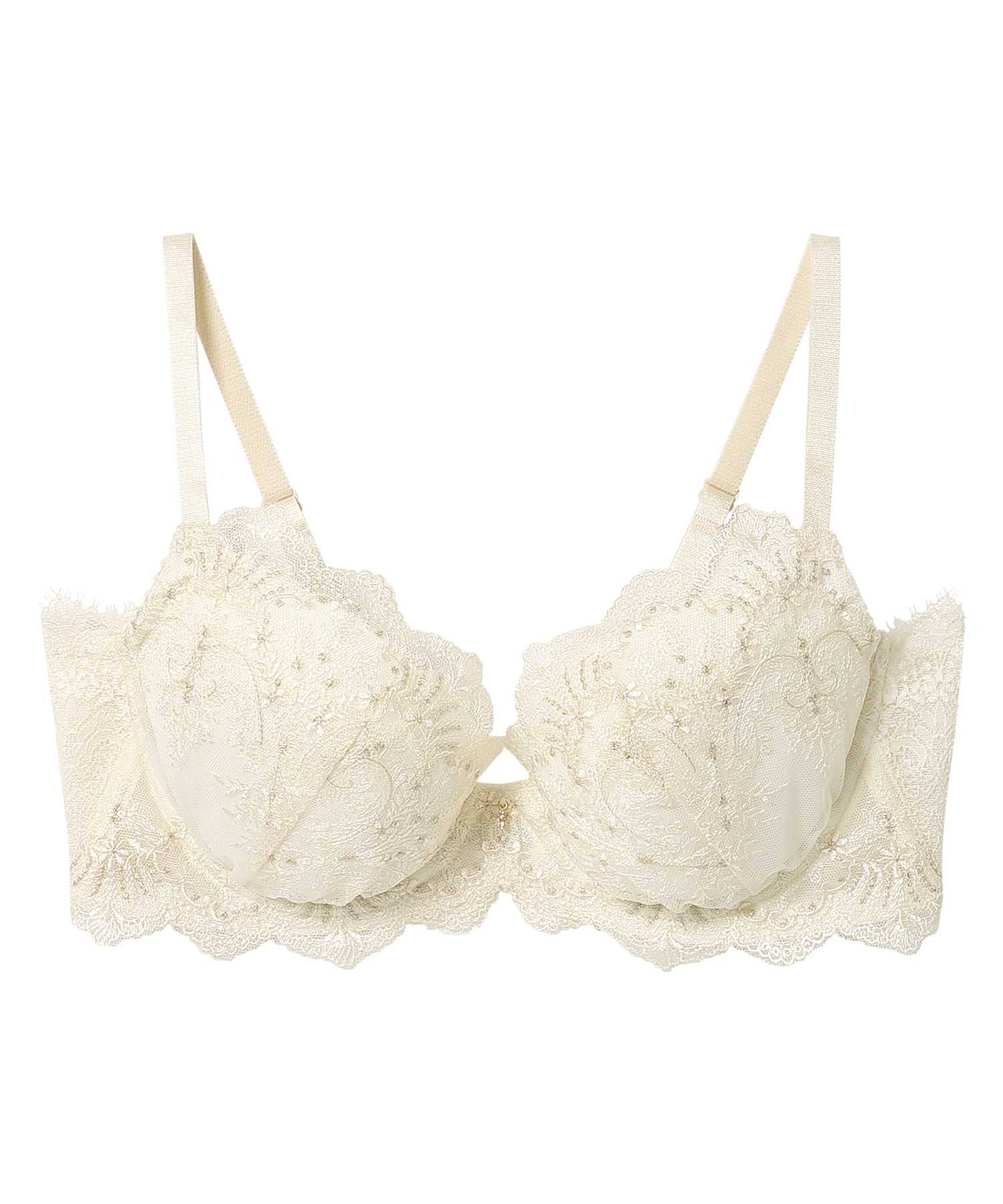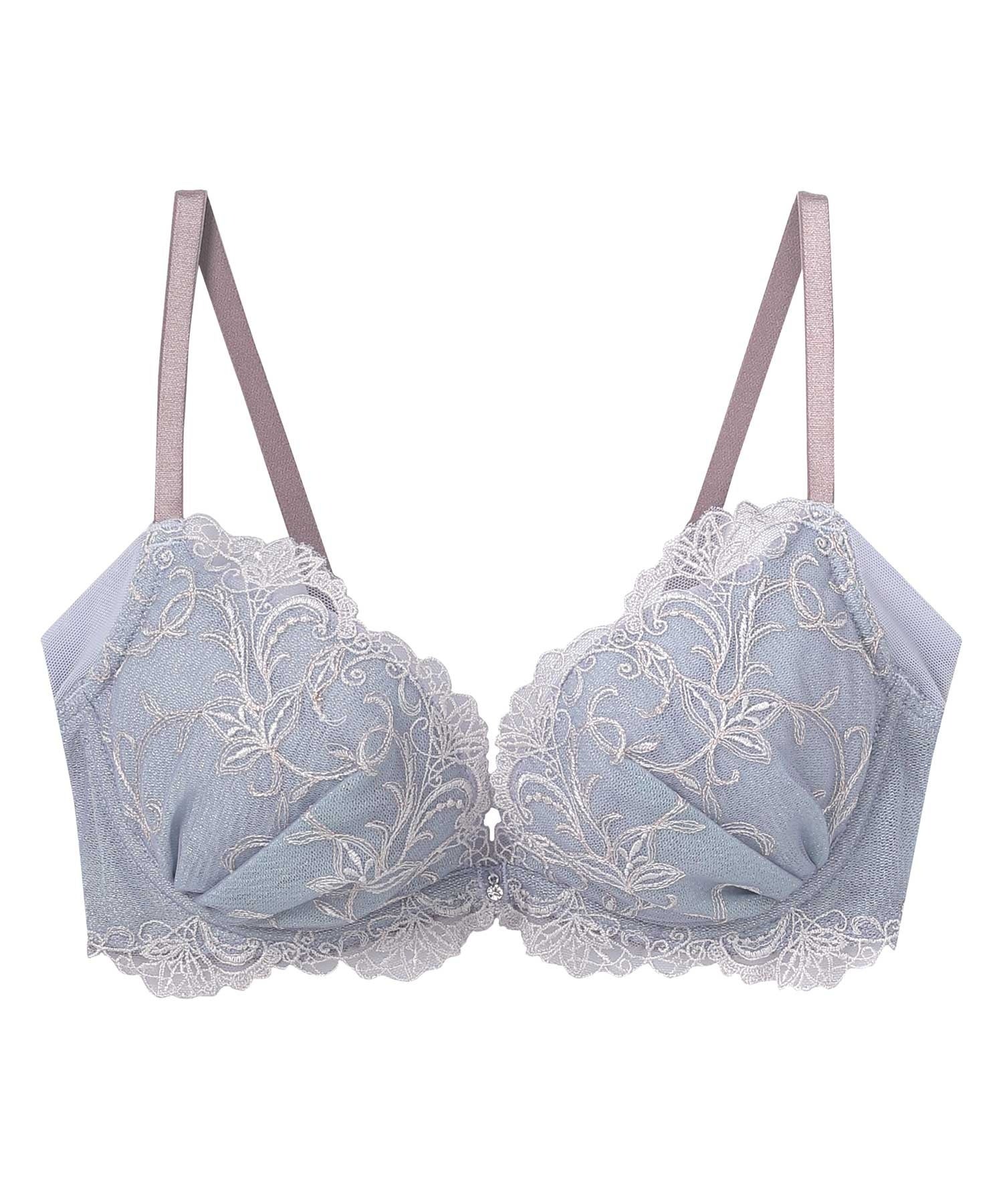 前中心が低いL字ワイヤーを使用し、脇高設計と上辺にテープを使用していない幅広のバックで、背中の段差や脇肉を抑える。ワイヤーがあたりにくく、軽いつけごこちで快適に身につけられます。