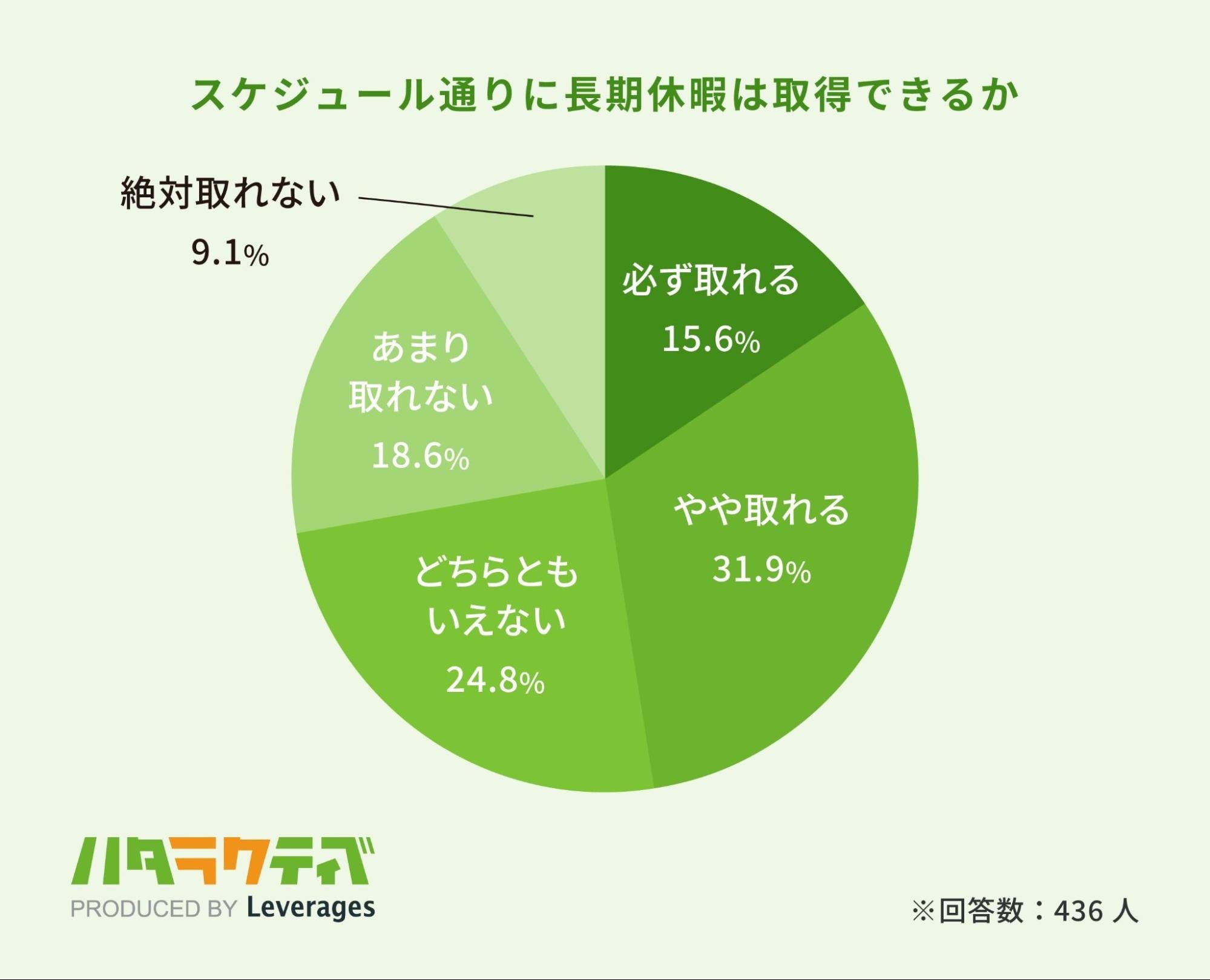 「GWなどの長期休暇をスケジュール通りに取得できるか」という問いでは、「必ず取れる(15.6%)」と回答した人は2割未満にとどまります。「やや取れる(31.9%)」と回答した割合は3割以上と、最も多くの割合を占めました。「特定の長期休暇は取得できる」や「長期休暇の全日を取得することは難しいものの、その一部の日数は取得できる」といったケースが予想されます。