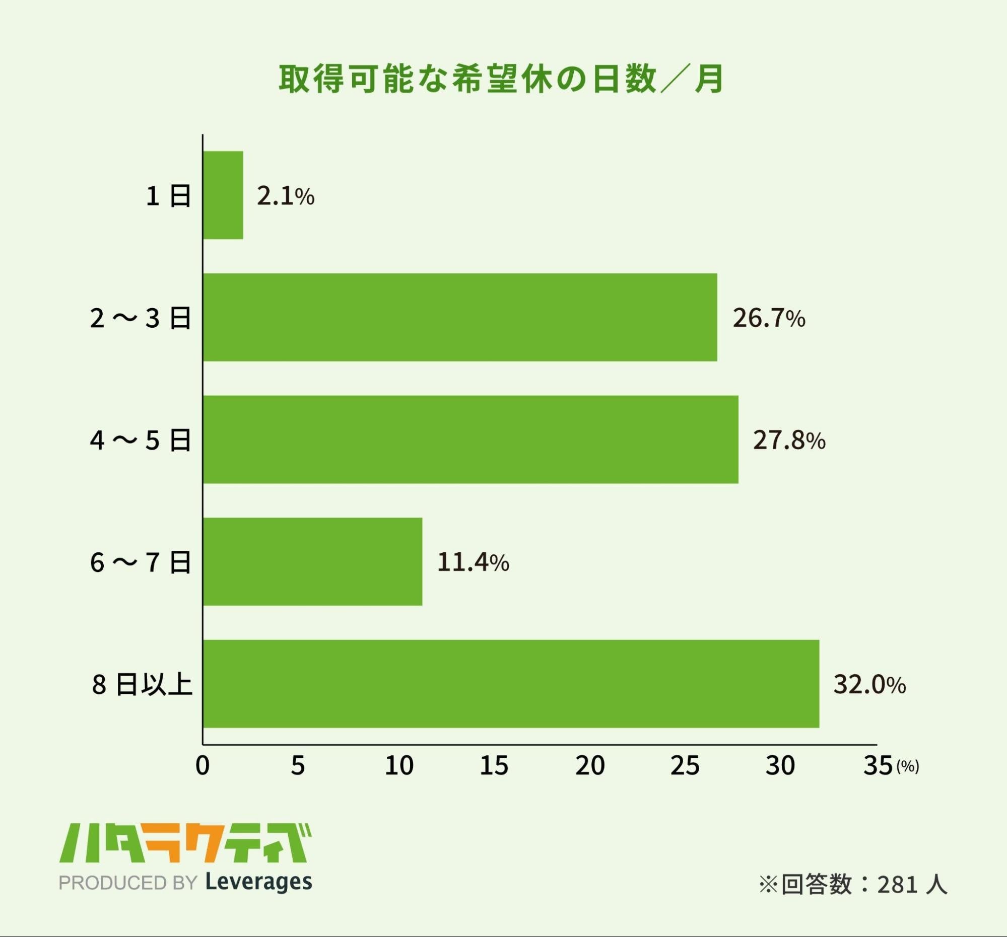 取得可能な希望休の日数は、30%以上が「8日以上」と回答し、最多となりました。企業によって希望休の取得日数にばらつきは見られるものの、約7割は1ヶ月に取得できる休日の半分以上を指定できるようです。
