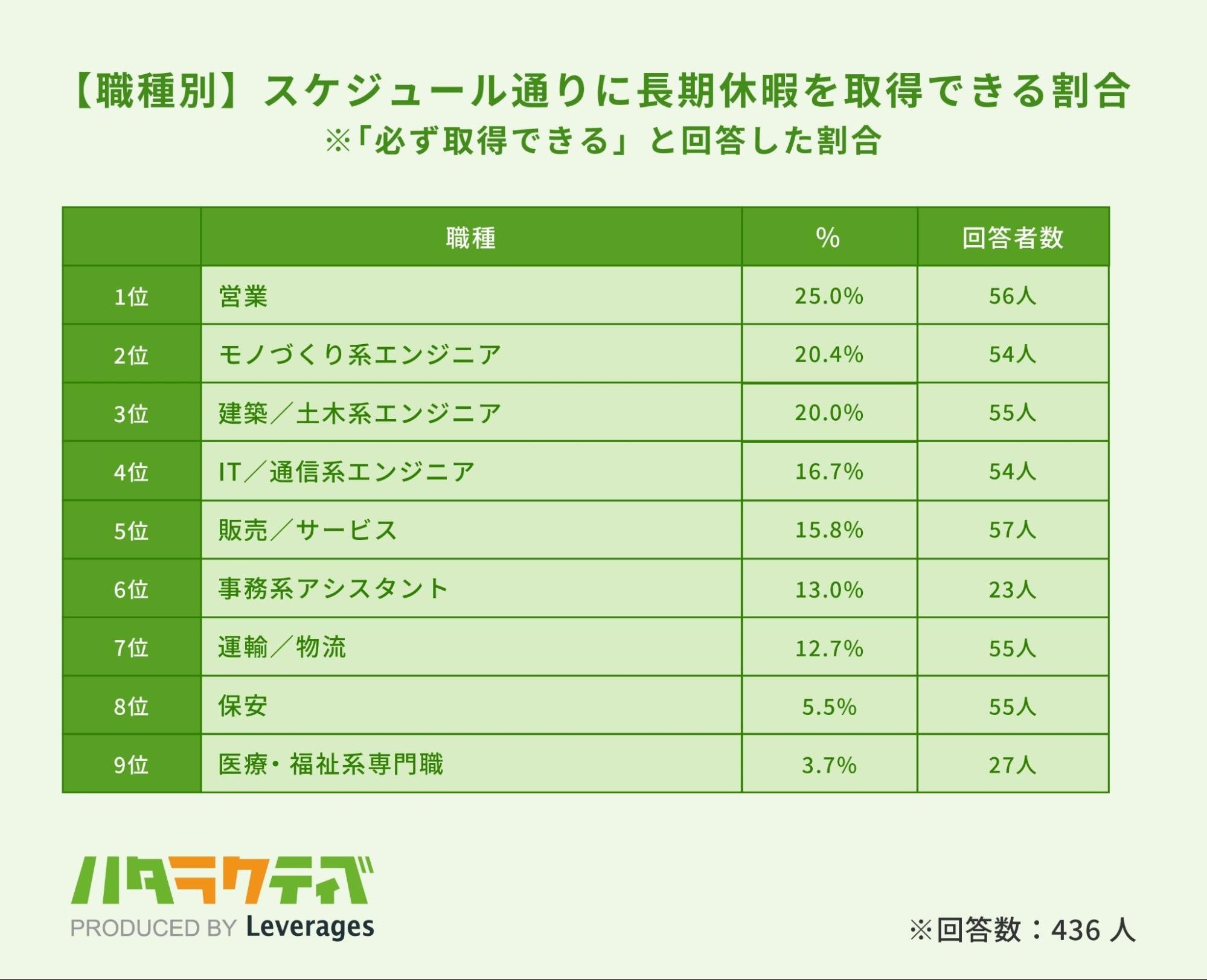 職種別にみると、営業職やエンジニア職は比較的長期休暇を取得しやすい傾向にあることが見受けられます。一方で、保安(5.5%)や医療・福祉系専門職(3.7%)は1割未満に留まることから、緊急事態などで迅速な対応が求められる職種は長期休暇をスケジュール通りに取得することが難しいようです。