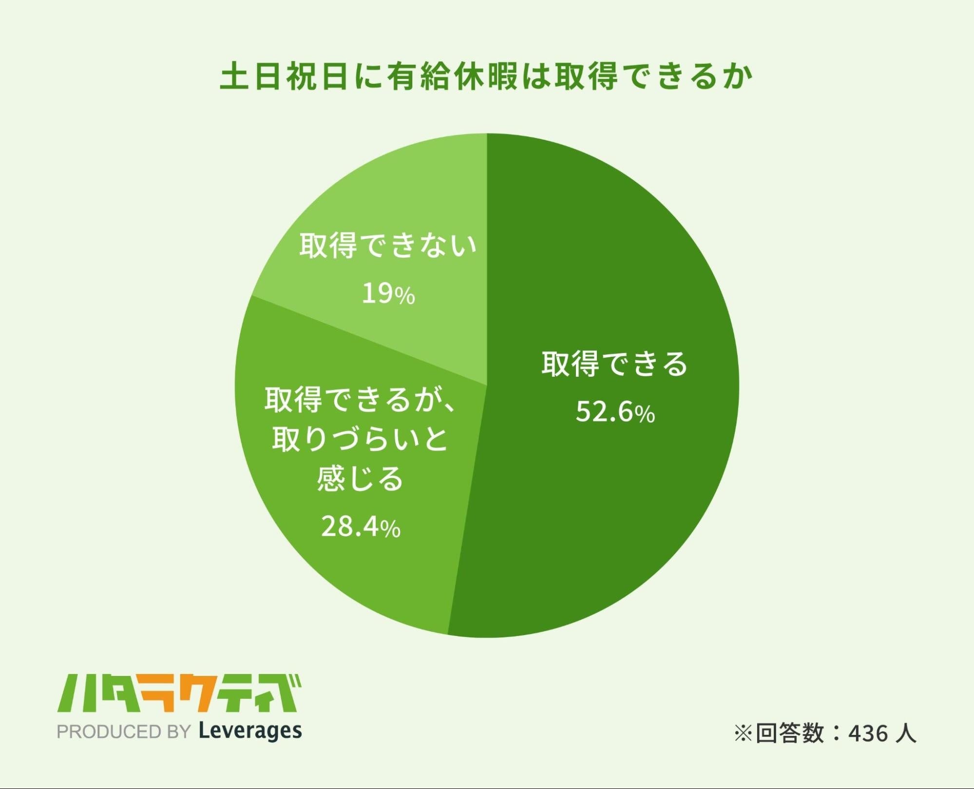 平日休みの約半数の社員は、土日祝日に「有給を取得できる(52.6%)」と回答したものの、約3人に1人は「取得できるが取りづらい(28.4%)」と回答しました。