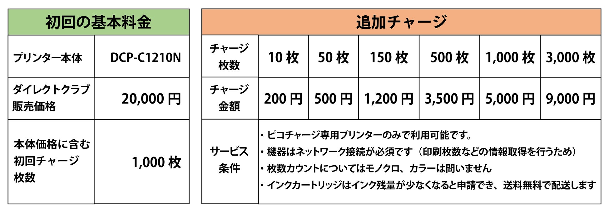 チャージ式プリンター「DCP-C1210N」のみ「ピコチャージ」を利用できる。