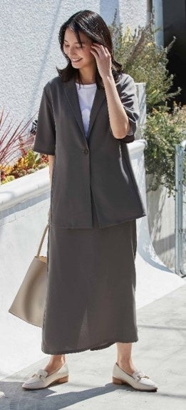 ジャケット、五分袖ジャケット、ワイドパンツ、タックパンツ、ロングタイトスカート、ブラウスと6アイテムで展開。組み合わせが幅広く選べるようになりました。