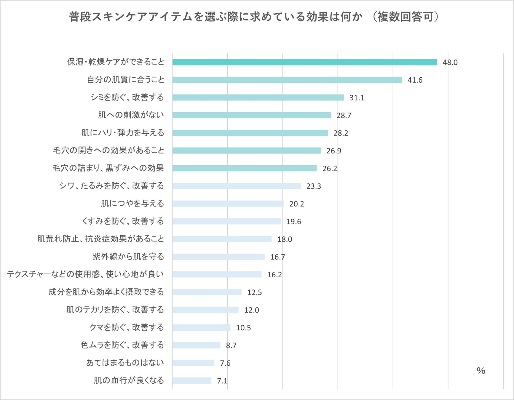 スキンケア商品に求めている効果は「乾燥・保湿ケア」が1位、シミ・ハリ・毛穴に対するケアも上位に