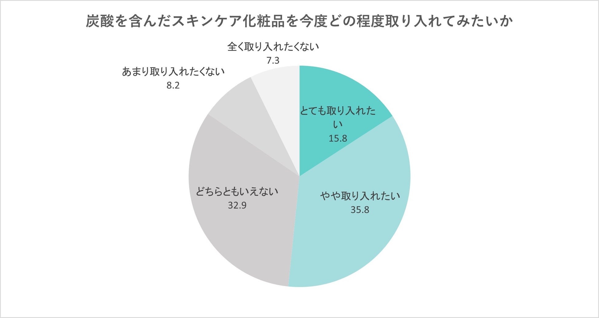 様々な美容効果が期待されている「炭酸美容」ですが、「炭酸を含んだスキンケア商品を取り入れてみたいか」という問いに対して、51.6%が取り入れてみたいと回答しています。
