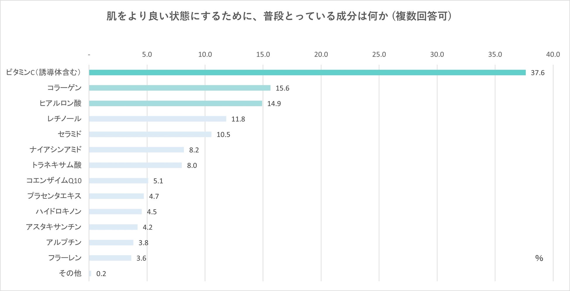「お肌をより良い状態にするために、普段取っている成分は何か」という問いに対し、「ビタミンC」が37.6%と最も多いことが分かりました。化粧品の「成分買い」がブームである昨今ですが、安全性が高く、メラニン合成の阻害や、皮脂分泌の抑制など、幅広い肌悩みに対応するビタミンCは不動の人気があることが分かります。