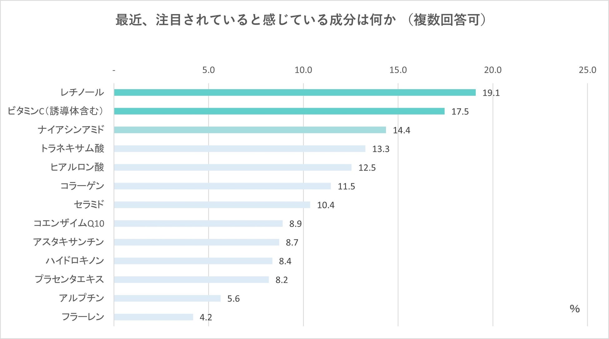 また、「注目されていると感じている成分は何か」という問いに対しては、「レチノール」がトップとなり、次いで「ビタミンC」「ナイアシンアミド」と続くことが分かりました。