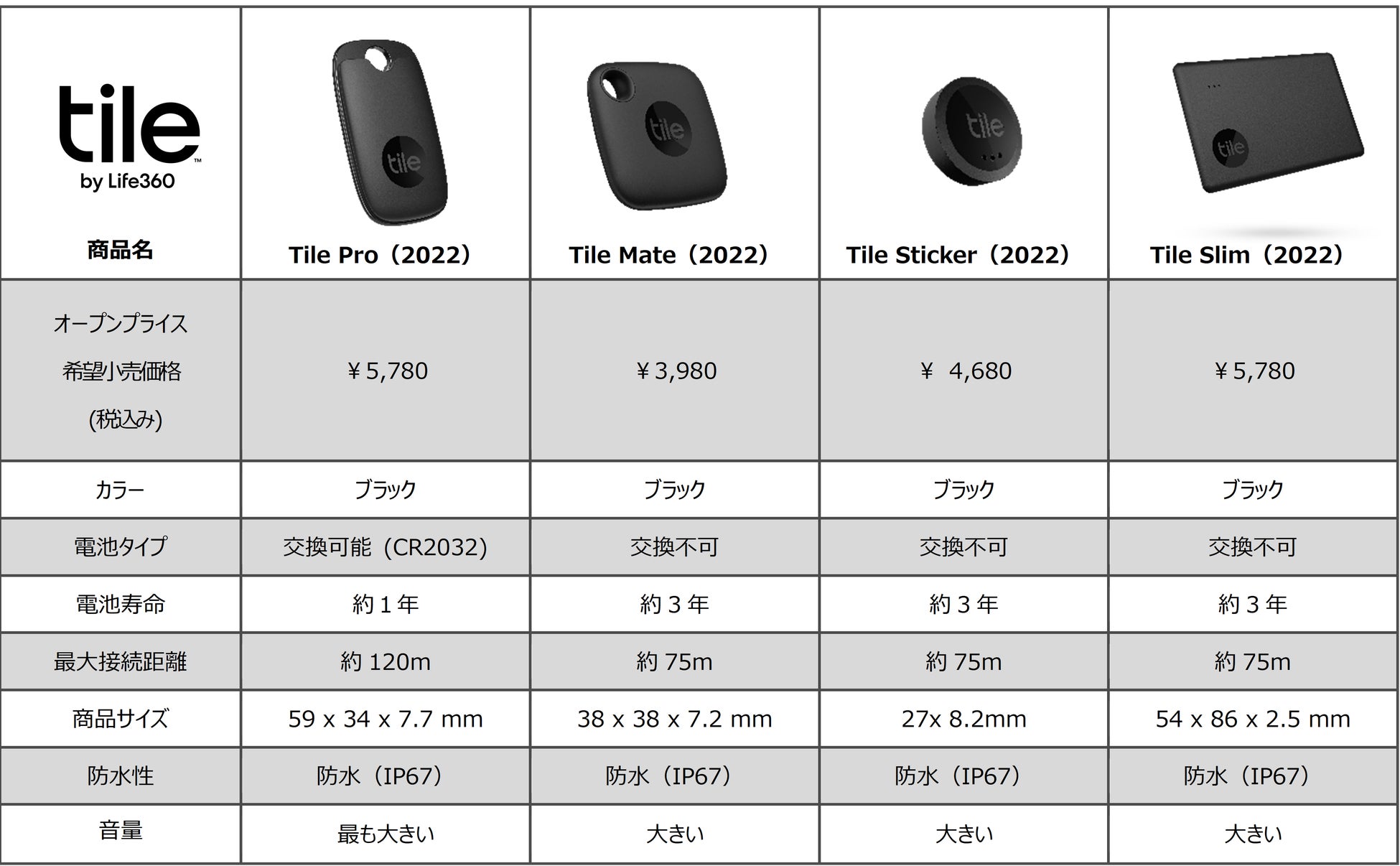 Life360の一員であるTileは、あらゆる物にスマートロケーションの力を与え、高いロケーション検索機能と150カ国以上にまたがる膨大なコミュニティーと、クラウドベースの検索プラットフォームを活用することで、毎日何百万ものアイテムの位置を特定し、日々、人々が大切なものを見つけられるよう支援しています。あらゆる物やシチュエーションにフィットする多様なデバイスに加え、オーディオ、トラベル、ウェアラブル、スマートホーム、PCなどのカテゴリーで「Find with Tile」を組み込んだ、55以上のパートナー製品を提供しています。カリフォルニア州サン・マテオを拠点とするTileは、2012年の創業以来、ファインディングテクノロジーのパイオニアとして活動しています。詳しくは、Tile.comをご覧ください。