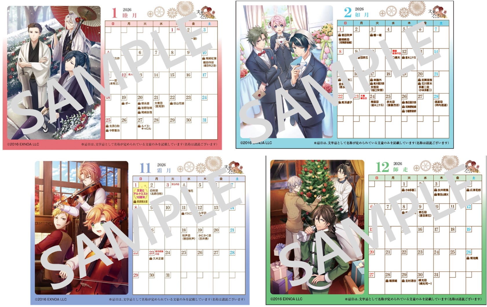 カレンダーは、2026年の1月から12月まで各月1枚ずつの計12種で、それぞれの月に合わせたイラストがデザインされており、ゲームに登場する文豪の誕生日など文学にまつわる特別な日が記載されています。