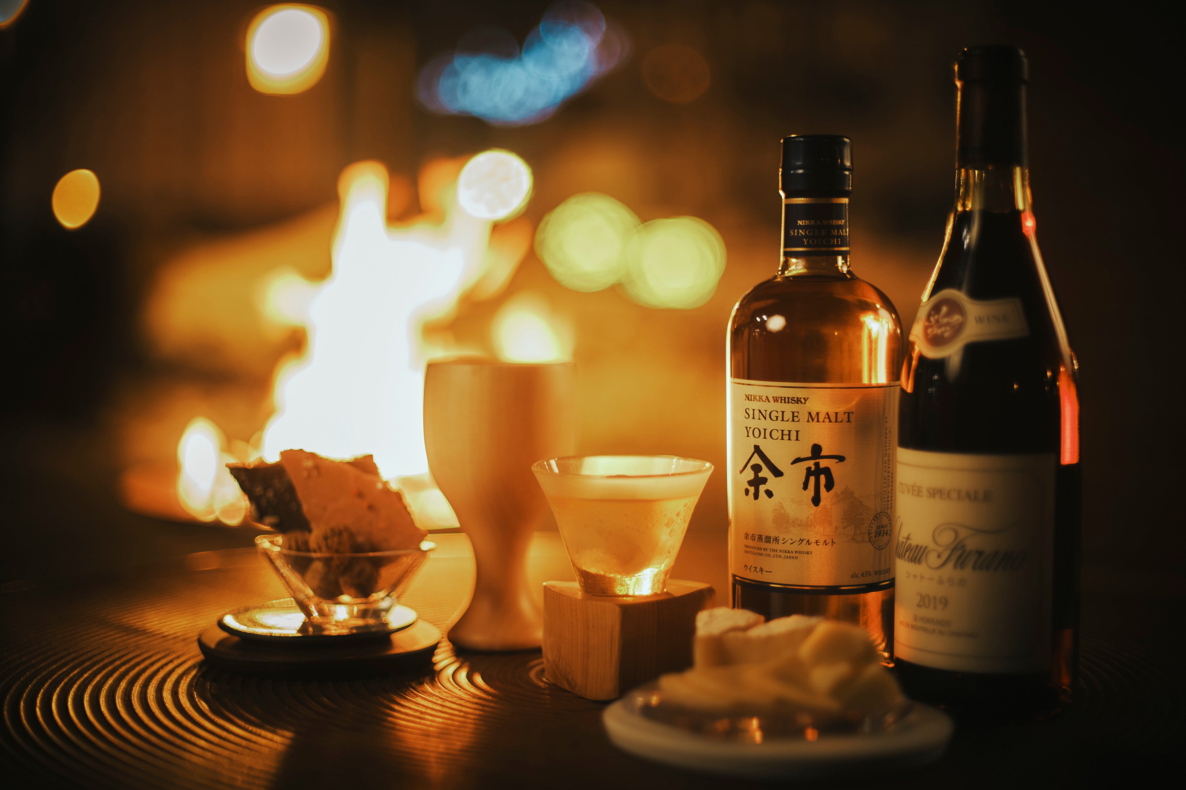 焚き火と共に楽しむドリンクやおつまみは、会場内に設置する旭川家具のBarカウンターにて提供します。お酒は昨年に続き、北海道のワインやウイスキーです。おつまみは旭川のチョコレートブランドである「RAMS CHOCOLATE」チョコレートや、チーズの盛り合わせを販売します。さらに、今年から開催する早朝営業に合わせ、ホットドリンクのメニューも充実します。