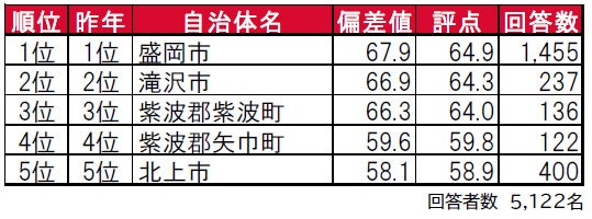 トップ5は、盛岡市と盛岡市に隣接する滝沢市・紫波郡紫波町・紫波郡矢巾町などが引き続き顔を並べる結果となっています。