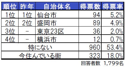 昨年に引き続き1位は宮城県仙台市、2位は岩手県