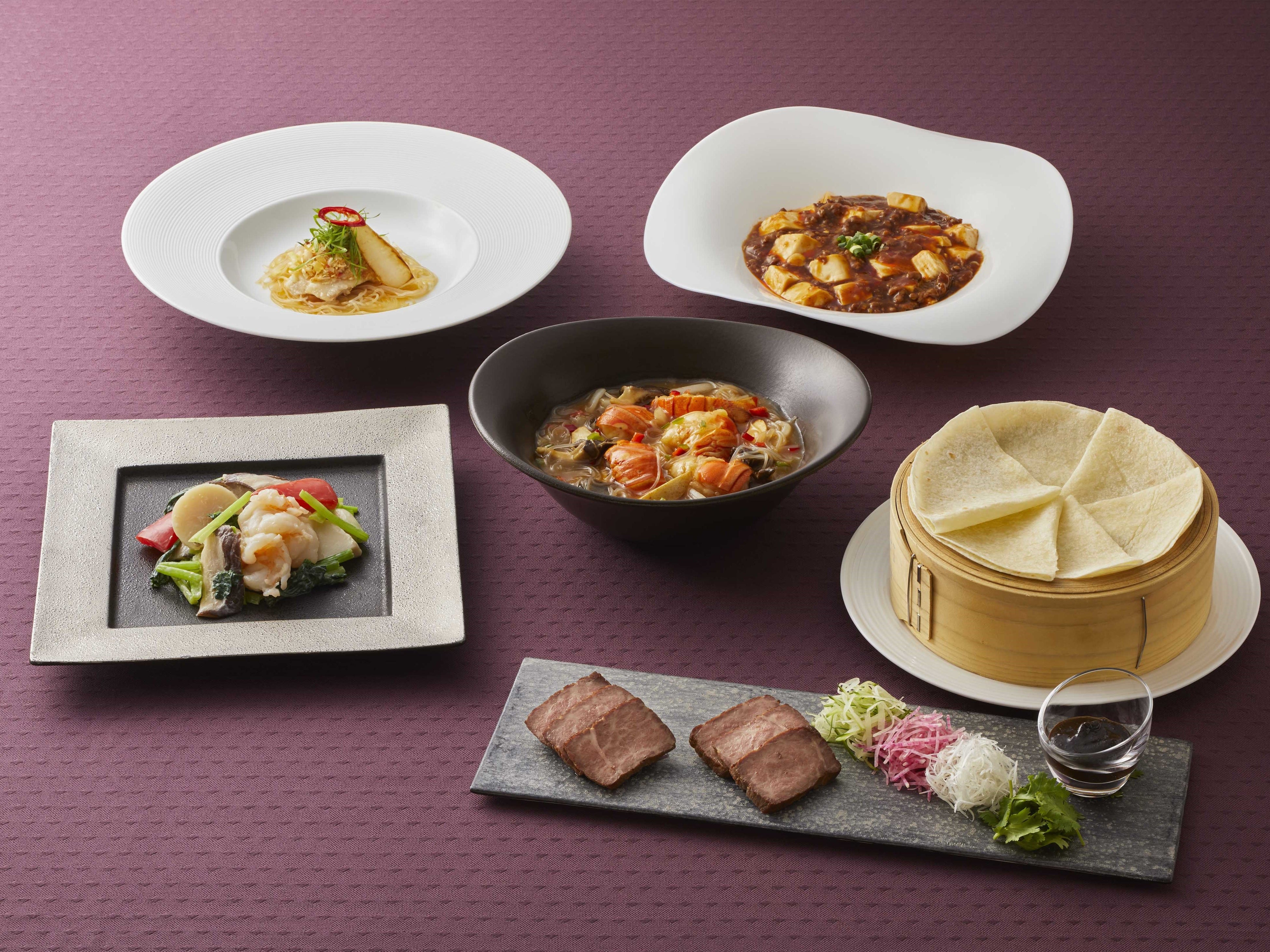 また、魚介の旨みを凝縮した沙爹醤で、贅沢にロブスター1尾と白菜や春雨を煮込んだ、身も心も温まる一品や、深いコクと甘味が特徴の自家製の甜麺醤が肉の旨みを引き出す、和牛のロースト チャイナクレープ包みなどをご用意いたしました。