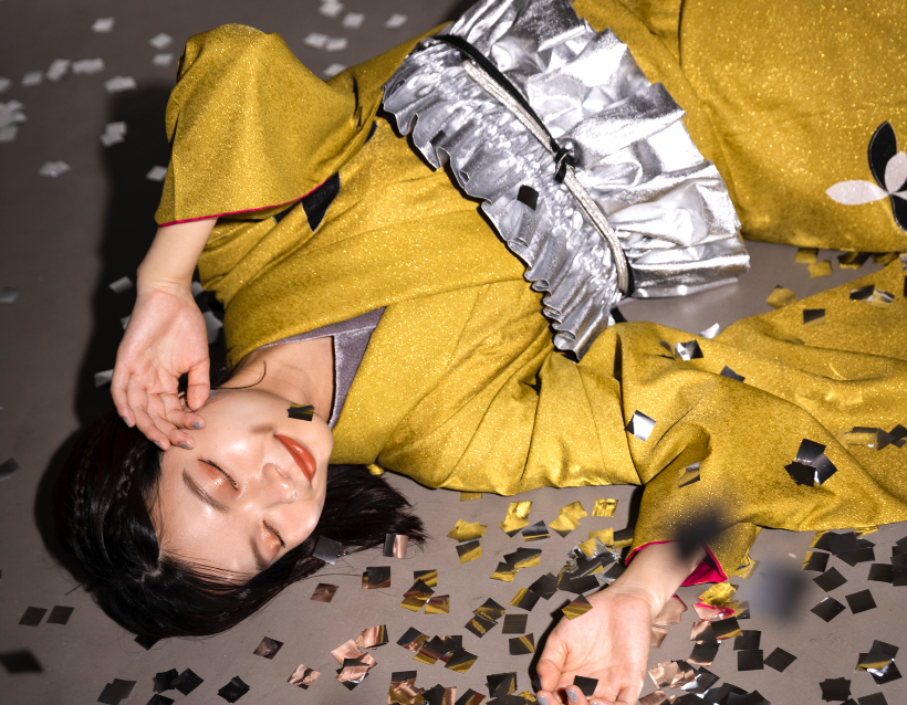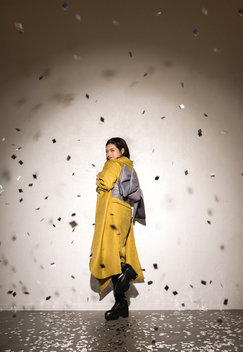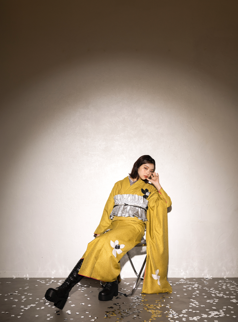 お花の柄がありラメ入りの黄色振袖は一見古典ポップな印象ですが、トレンドのマルチギャザーフリルのメタリックを帯にon。ギラっと光る存在感がたまらない。