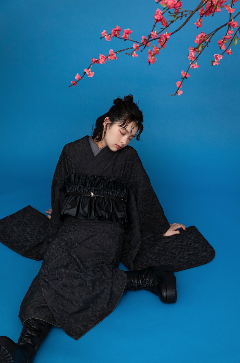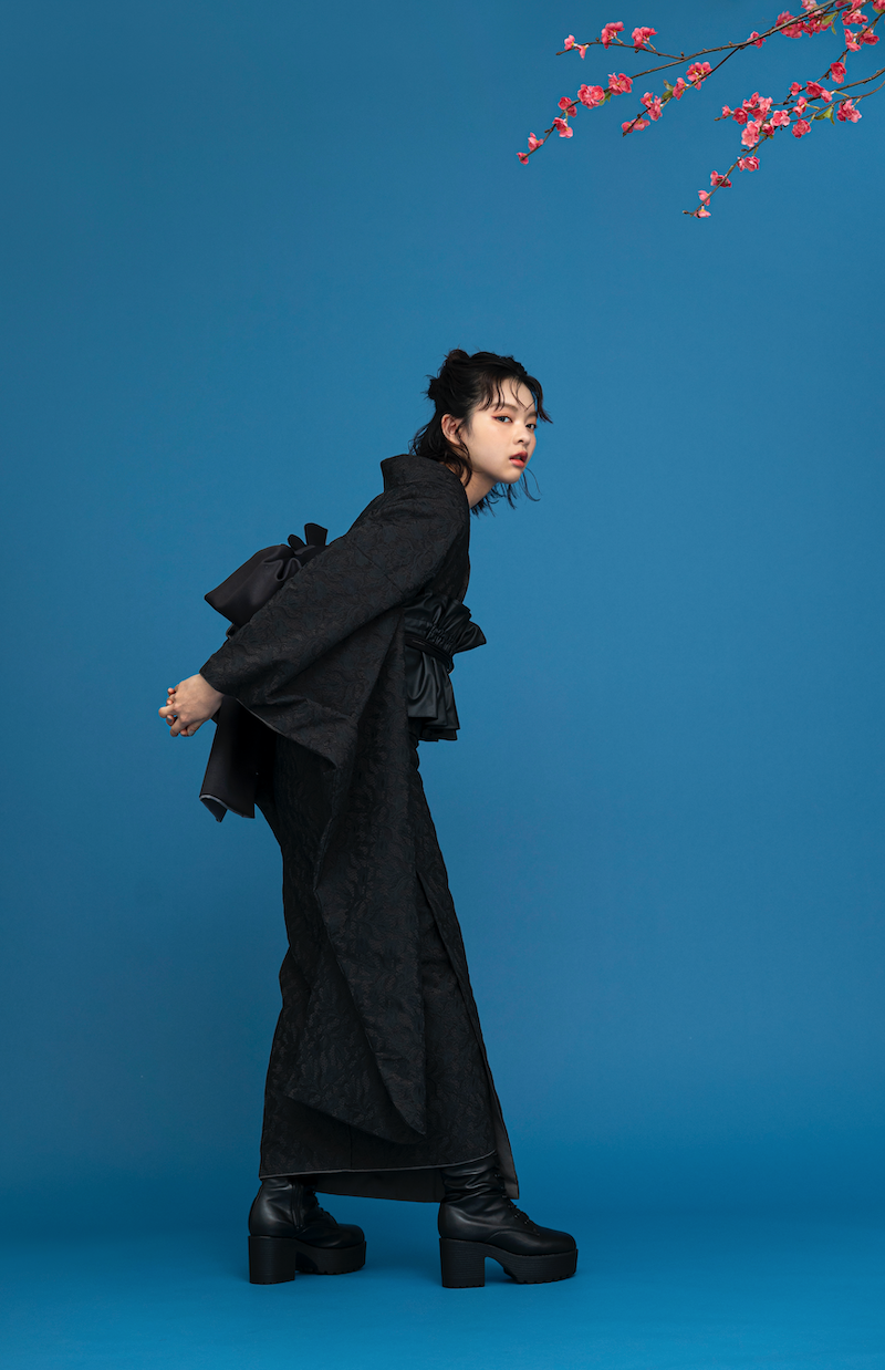 今回黒レザーのマルチギャザーフリルを帯に使用し、足元は厚底のロングブーツを合わせ 甘くさせないaimmeならではのコーディネート。