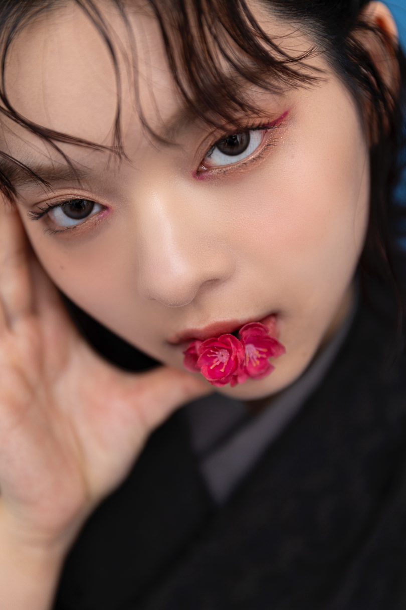 メイクは梅と同じくらいの鮮やかなピンクを目元にon。