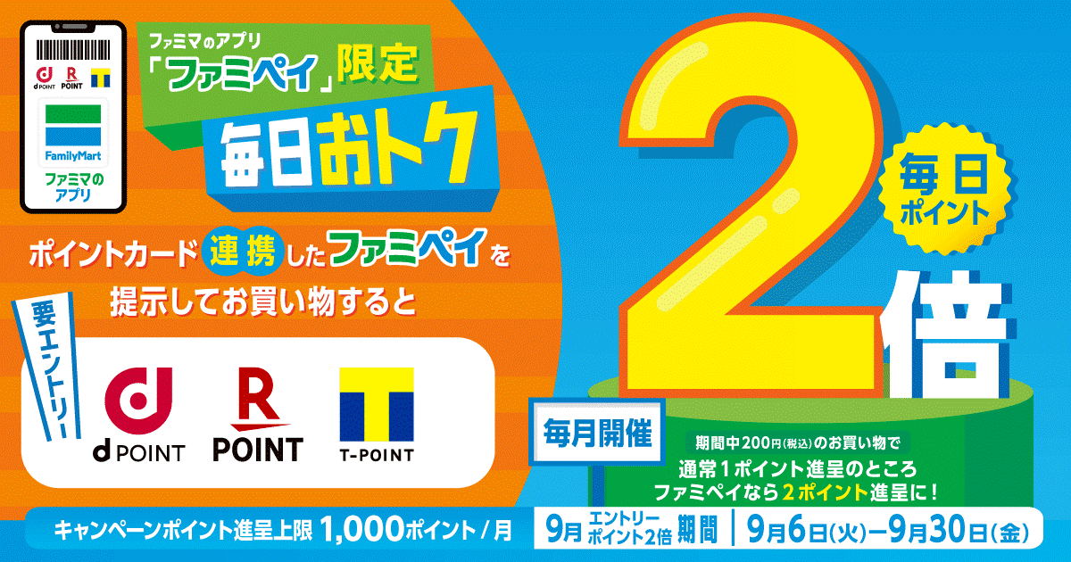 9月は毎日"2倍" ポイントがたまる!ファミマのアプリ「ファミペイ」限定dポイント・楽天ポイント・Tポイントがいつもよりおトク!