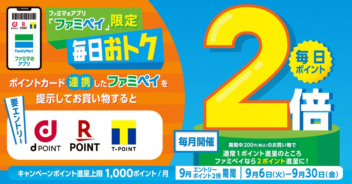 株式会社ファミリーマート(本社:東京都港区、代表取締役社長:細見研介)は、昨年から取り組んでいる5つのキーワードの1つである「たのしいおトク」の一環として、2022年9月6日(火)よりファミマのアプリ「ファミペイ」(以下:「ファミペイ」)限定でdポイント・楽天ポイント・Tポイントが毎日2倍たまるおトクなキャンペーンを実施いたします。