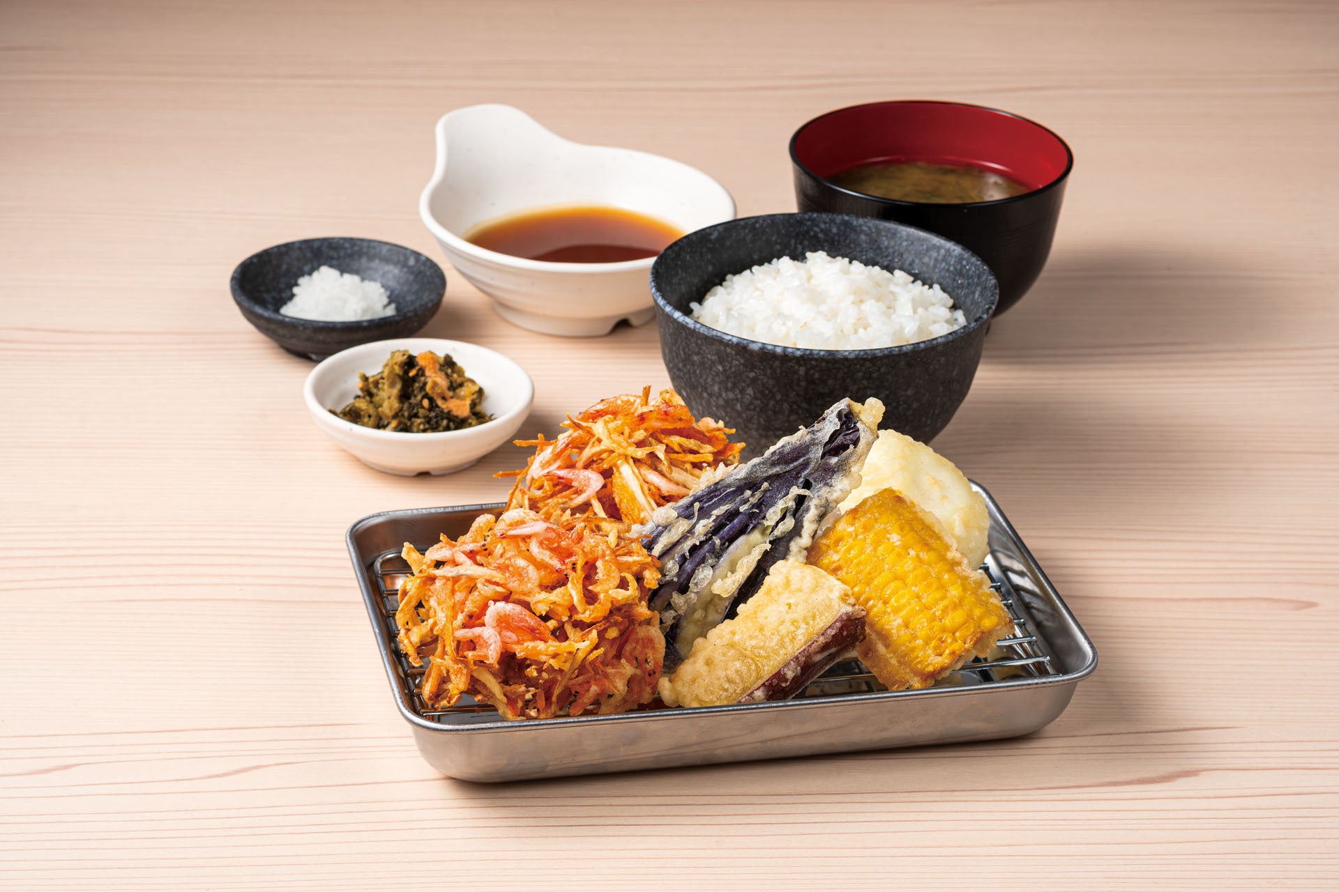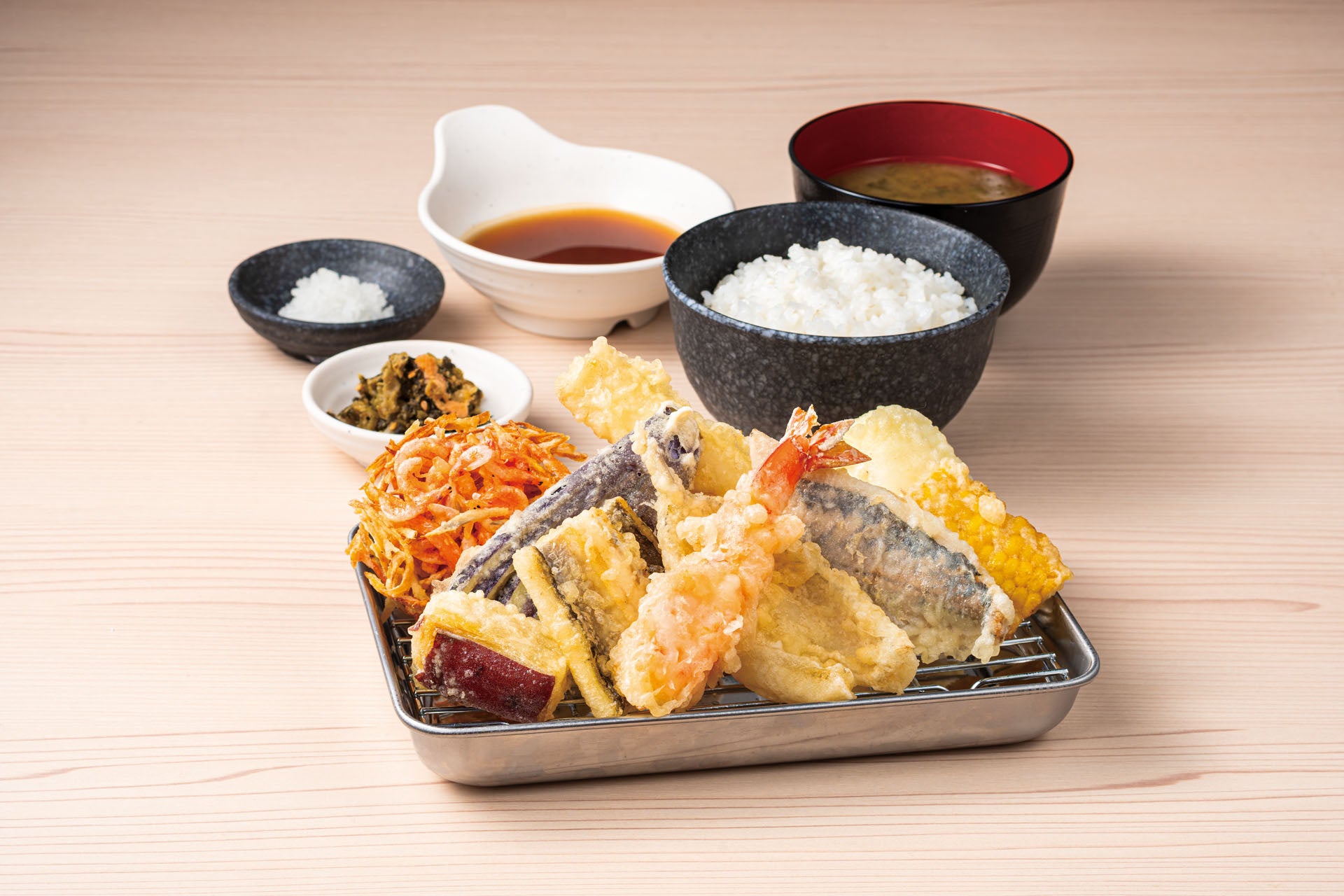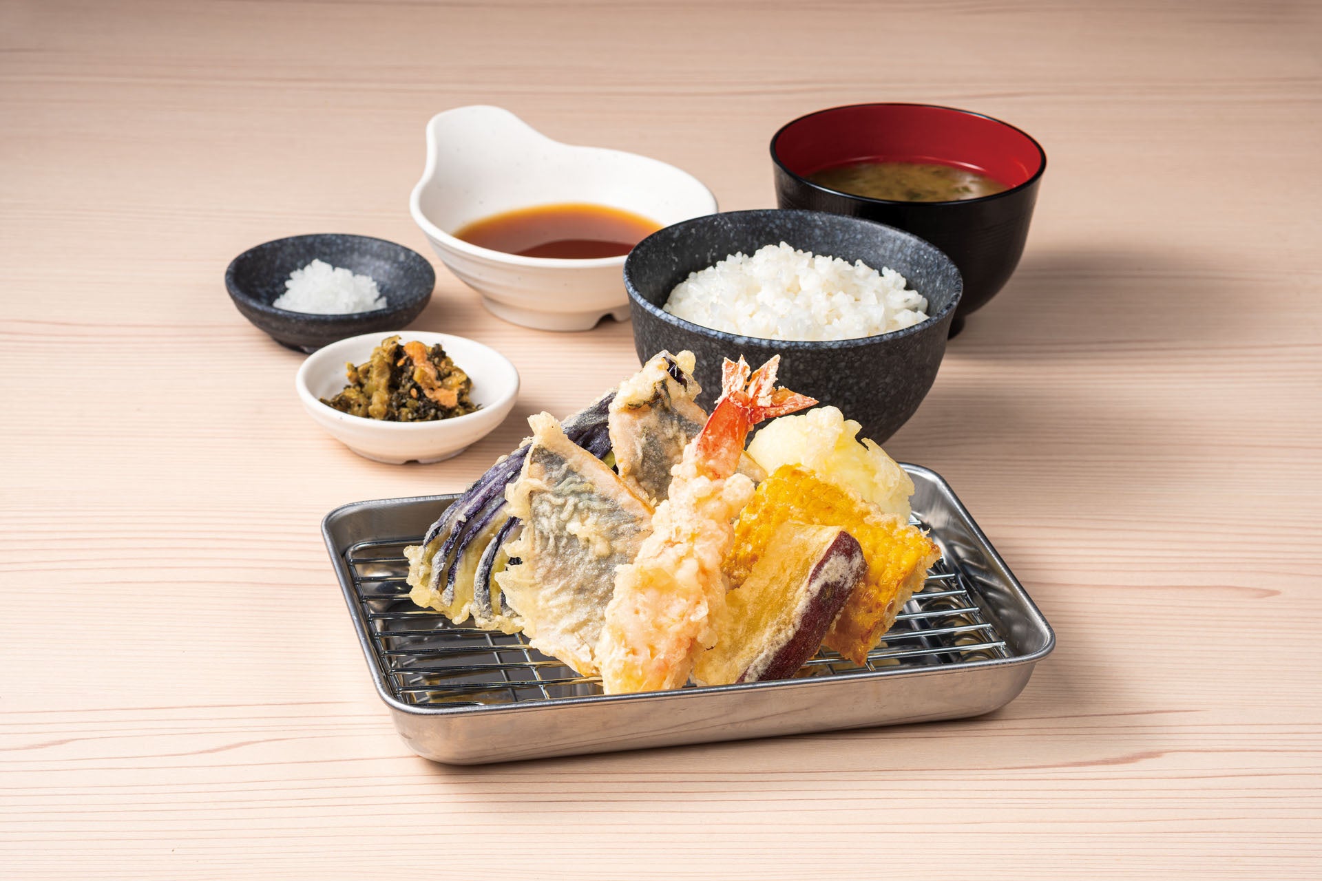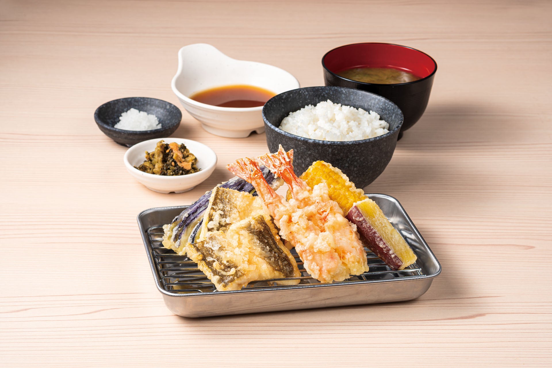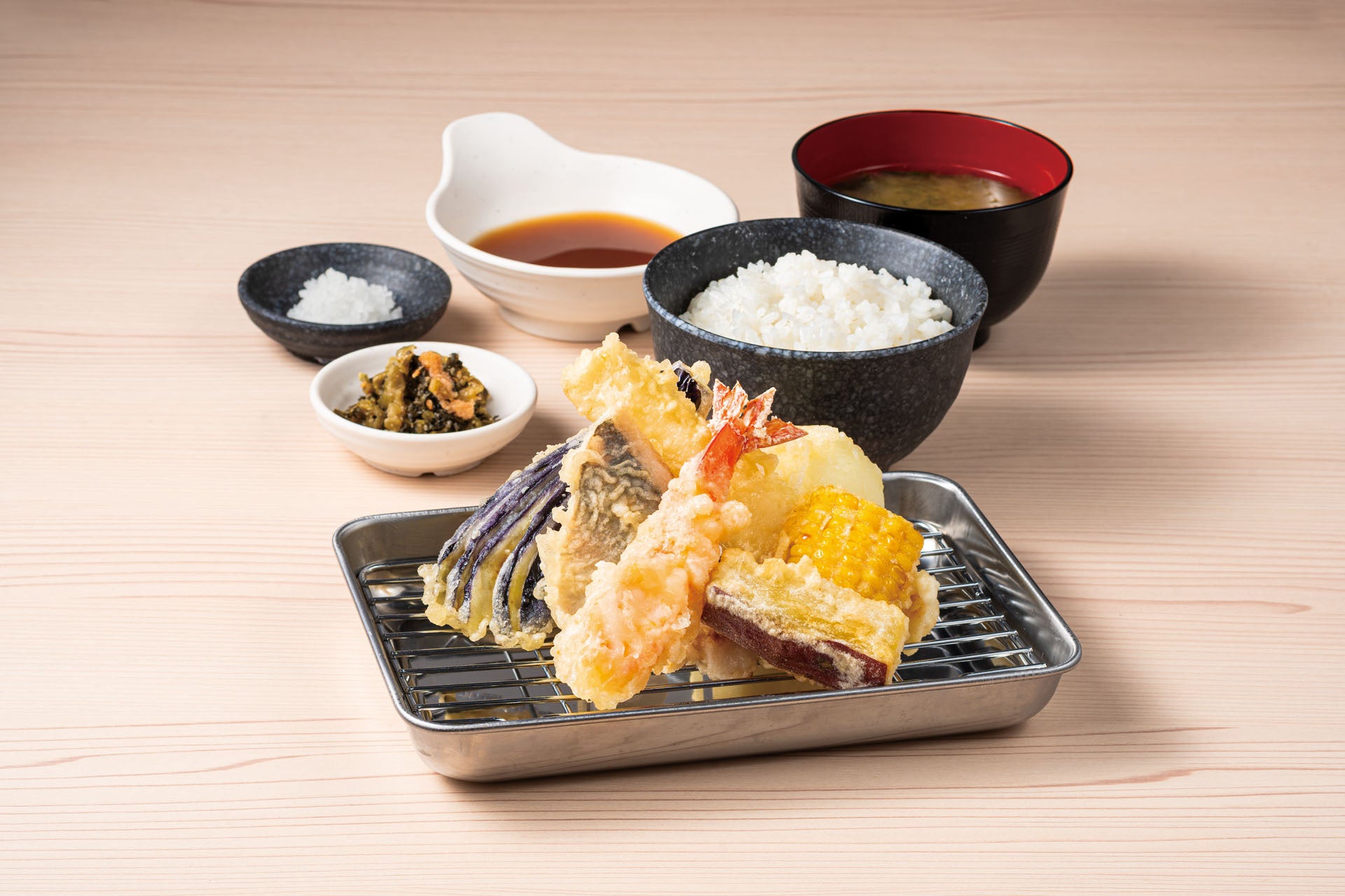 『天ぷら定食 あおぞら』の油は、“何度も食べたくなる天ぷら”を実現させるため幾度も試してようやくたどり着いた「あおぞらブレンド」を使用しています。天つゆは、“天つゆで記憶に残る店”を目指し、鰹出汁と焼きあご出汁を使用しており、思わず飲みたくなる天つゆに仕上げました。さらに、天ぷら粉は、衣付きが良く、素材由来の塩味と旨みを味わえるものを採用しています。