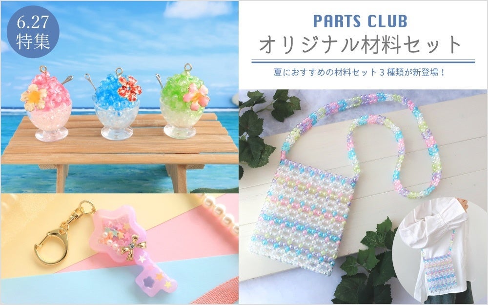 今年のパーツクラブでは、夏の工作におすすめしたい、必要な材料とレシピが揃った「パーツクラブオリジナル材料セット」をご用意いたしました。色とりどりのビーズを使用したビーズステッチ、本物のようなかき氷やカワイイを詰め込んだ星型の鍵をレジンで作れるセットなど 親子で一緒に楽しめるだけでなく、ハンドメイドに挑戦したい大人の第一歩にもイチオシの材料セットです。