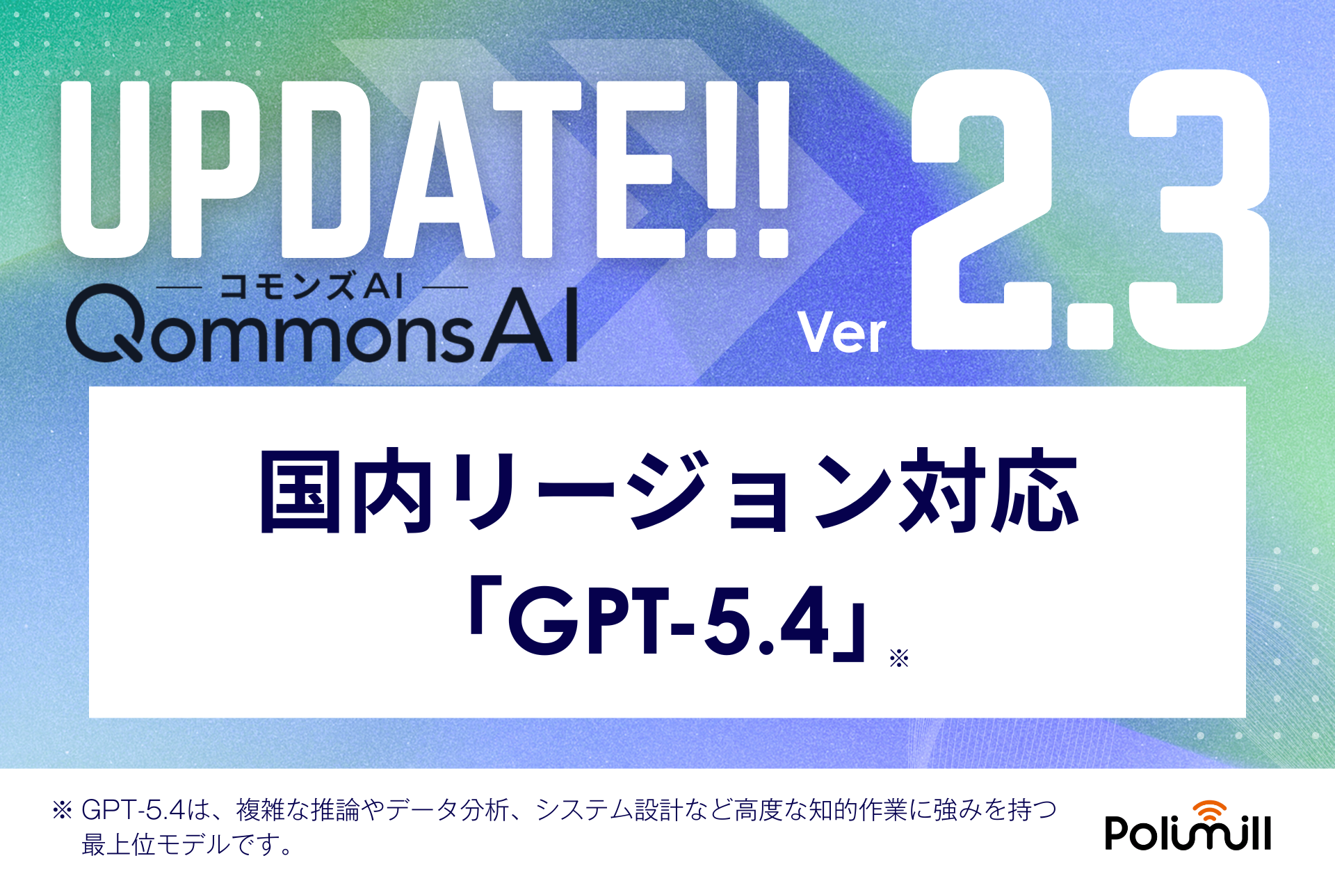 行政のAXをリードするPolimill株式会社(本社:東京都港区、代表取締役:伊藤あやめ/谷口野乃花)は、行政向け生成AI「QommonsAI」において、OpenAI社の最新フロンティアモデル「GPT-5.4」をAzure OpenAI Service国内リージョン経由で搭載することをお知らせいたします。これにより、各自治体は月間3億トークン(約2.1〜3億文字相当)を費用なしでご利用いただけます。