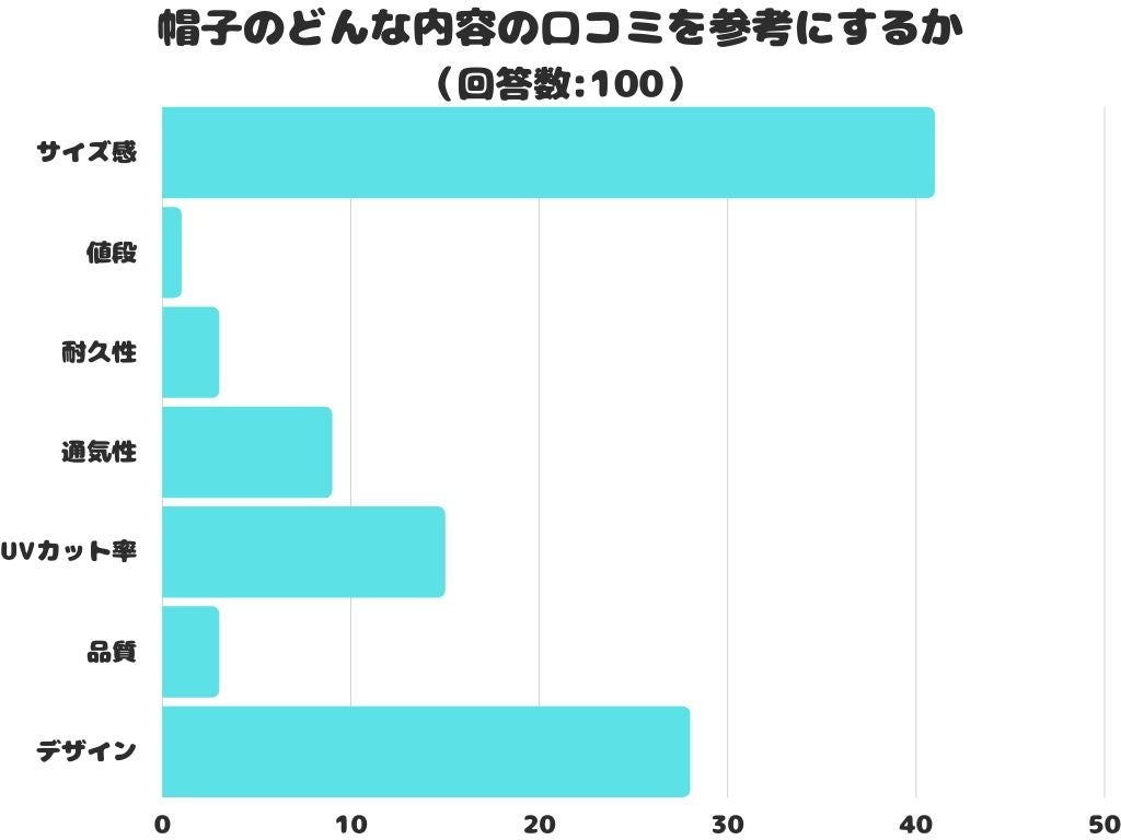 帽子のどんな内容の口コミを参考にするかをアンケートにて調査したところ、1位は「サイズ感」でした。