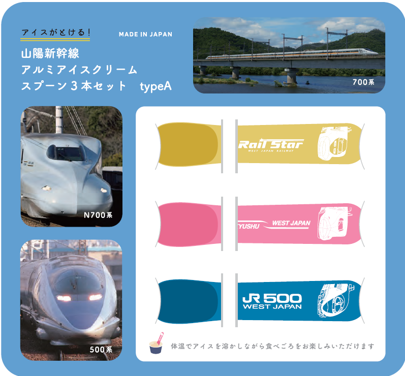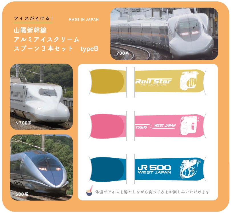 山陽新幹線で「こだま」として活躍する500系7000番台、「ひかりレールスター」や「こだま」として活躍する700系7000番台、山陽・九州新幹線を直通する「みずほ」「さくら」を中心に活躍するN700系7000番台をデザインしたアルミアイスクリームスプーンの3本セットです。