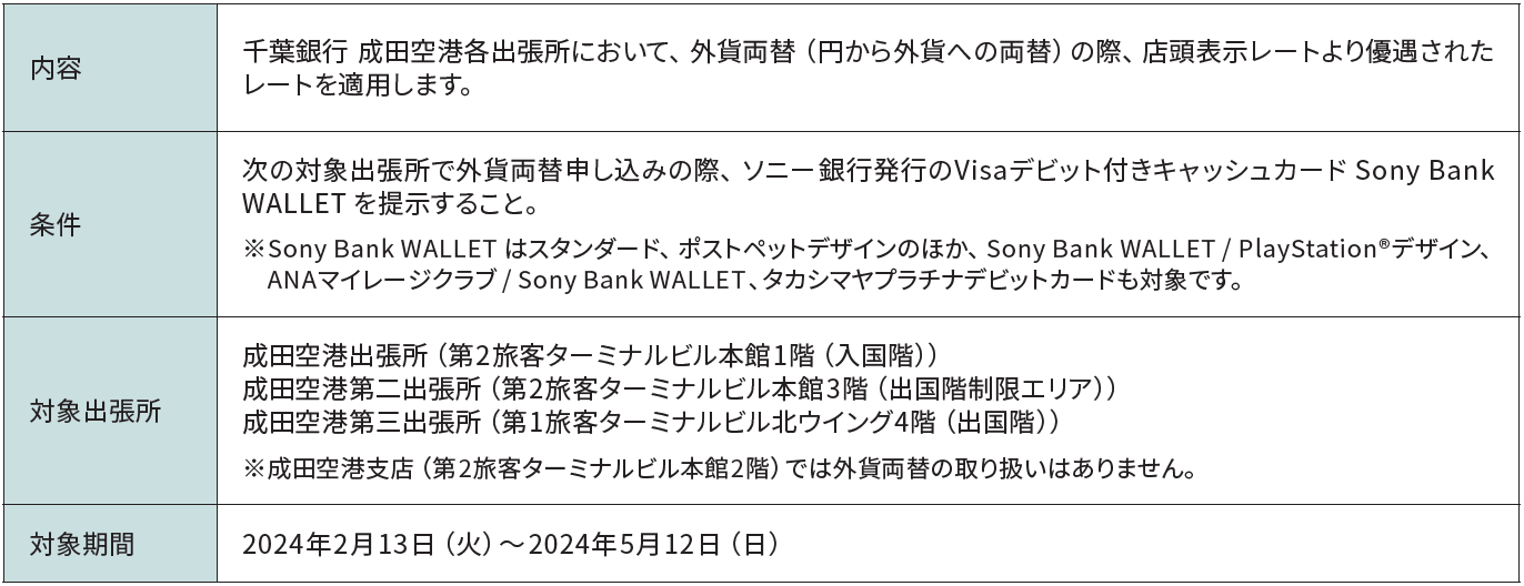 ソニー銀行株式会社(代表取締役社長:南 啓二、本社:東京都千代田区、以下「ソニー銀行」)は、株式会社千葉銀行(取締役頭取:米本 努、本社:千葉県千葉市、以下「千葉銀行」)と「千葉銀行 成田空港各出張所における外貨両替優遇キャンペーン」を2024年2月13日(火)より実施しますので、お知らせいたします。