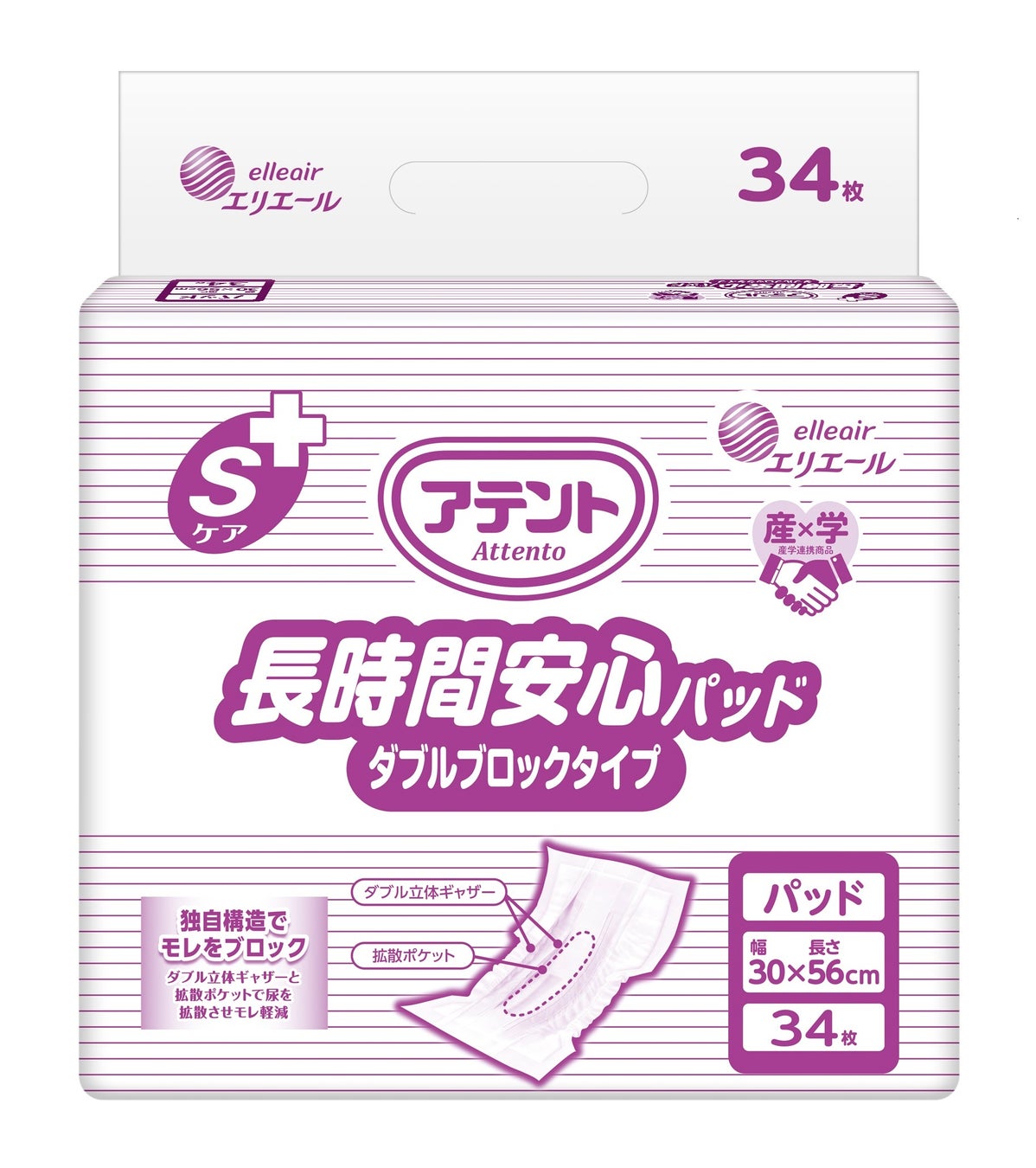 そこでこのたび、パッドのあて方の工夫では難しいモレも低減する「ダブル立体ギャザー」「拡散ポケット」の仕様はそのままに、肌にあたる表面シートの逆戻りと立体ギャザーの摩擦を低減させ、さらに肌にやさしくなった『アテント Sケア 長時間安心パッド ダブルブロックタイプ』をリニューアル発売します。