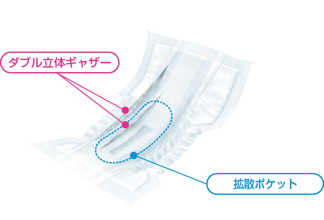 ・「拡散ポケット」が股間部の吸収スペースを確保し、尿を素早く拡散してあふれモレを防ぎます。