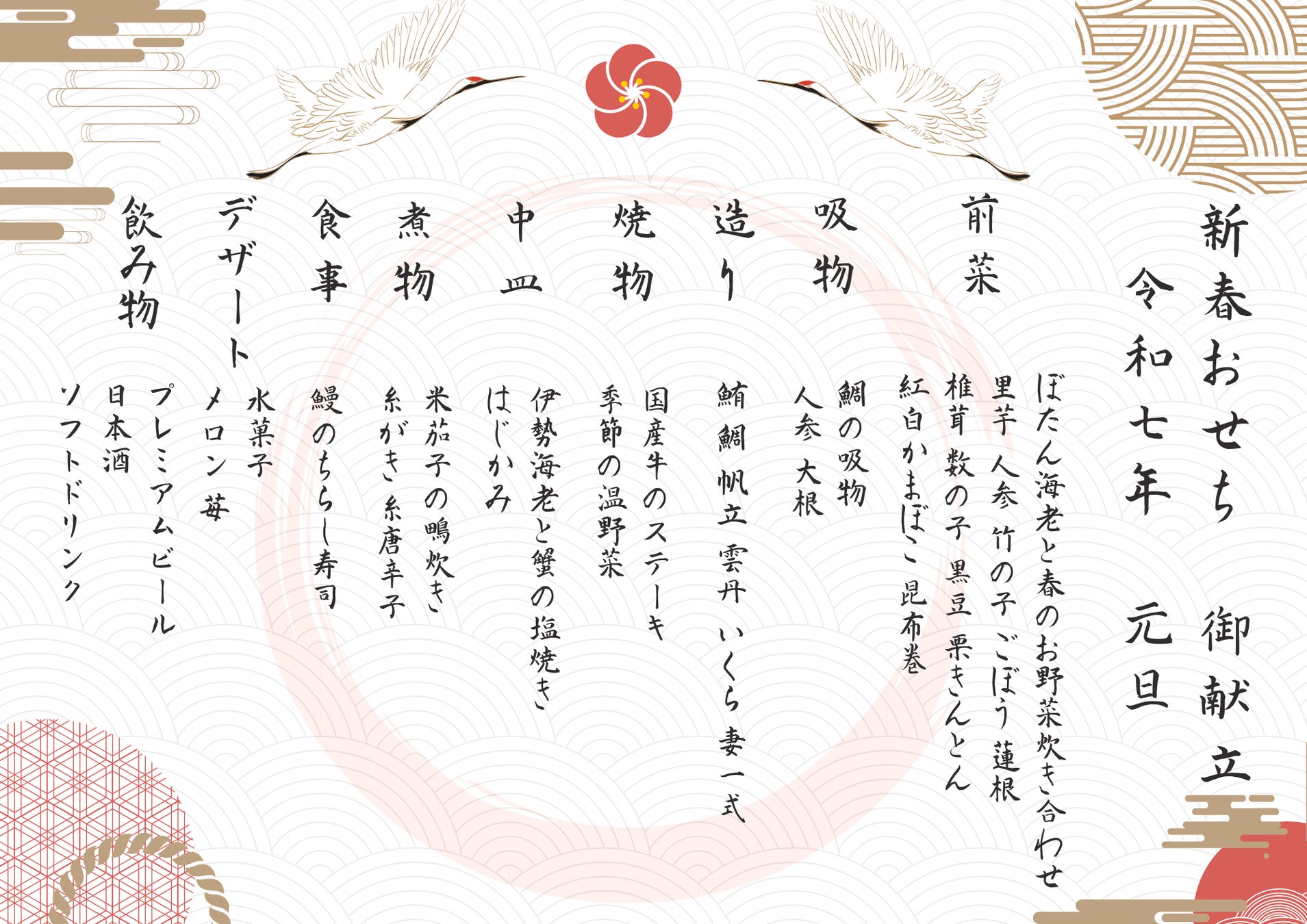 内容:新春おせち朝食、レイトチェックアウト12:00(通常11:00)