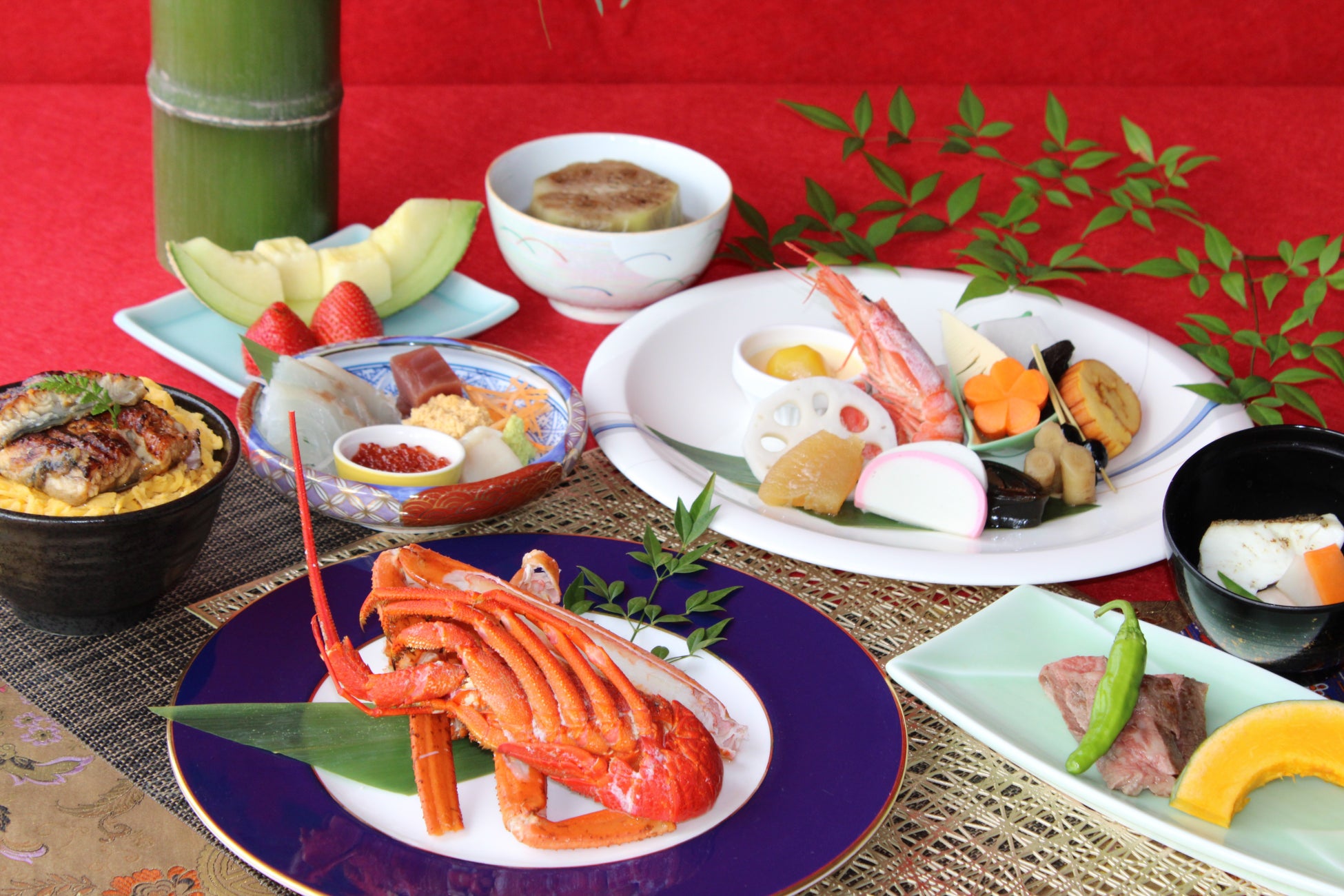 選べる乾杯ドリンクと、祝い肴として定番の黒豆・数の子のほか、ぼたん海老と春野菜の炊き合わせなどの華やかな前菜から始まる「新春おせち朝食」は、コース仕立てでご提供いたします。料理長厳選の新鮮なお造り、ミディアムレアに仕上げた国産牛のステーキ、不老長寿の願いを込めた伊勢海老の塩焼き、御食事にはじっくり蒸してから香ばしく焼き上げた鰻のちらし寿司など、豪華食材をふんだんに使った「新春おせち朝食」を大切な方とお楽しみください。