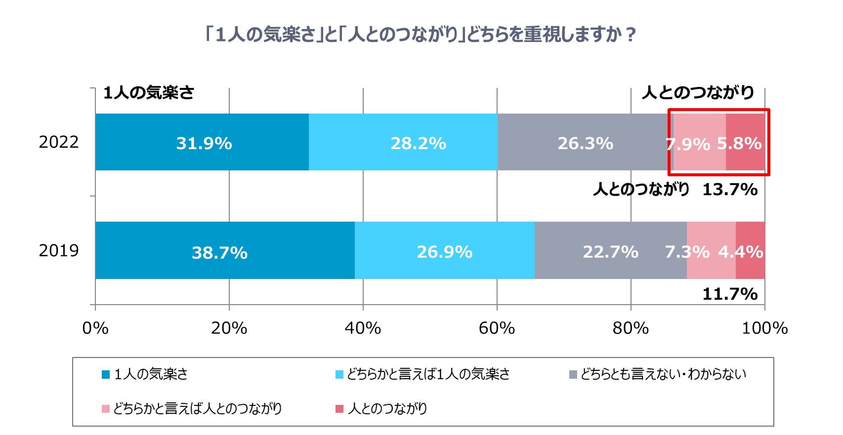 「どちらかと言えば人とのつながり」と答えた7.9%と、「人とのつながり」と答えた5.8%をあわせた13.7%が1人の気楽さよりも人とのつながりを重視していると回答しました。コロナ禍以前の2019年の調査結果である11.7%と比べて2.0ポイント上昇しています。