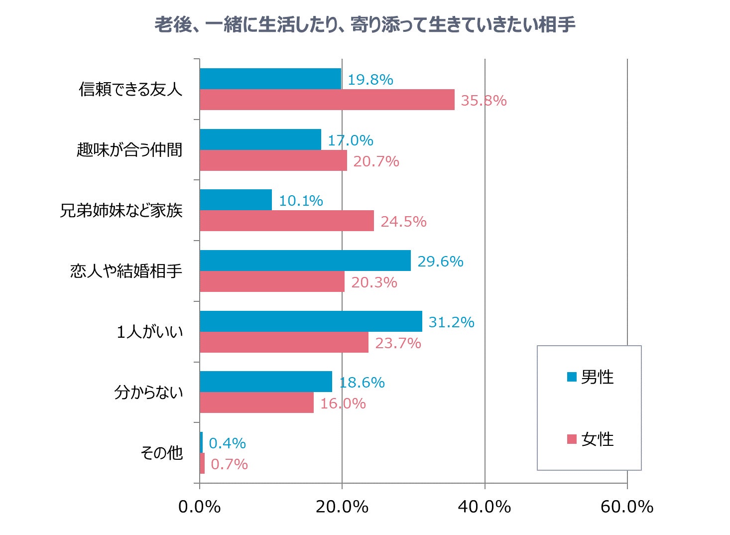 女性の回答で最も多かったのは「信頼できる友人」で35.8%、続いて「兄弟姉妹など家族」が24.5%でした。一方男性では「1人がいい」という回答が31.2%で最も多く、次点が「恋人や結婚相手」で29.6%でした。