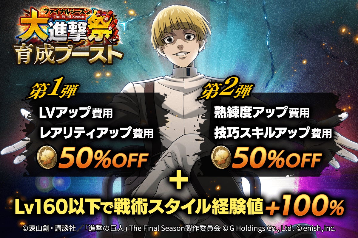 2022年11月15日(火)より、様々な育成費用が半額になる育成ブースト第1弾を開催!さらに、戦術スタイルLv160以下の獲得経験値が100%アップ!この機会に戦闘力も進撃だ!