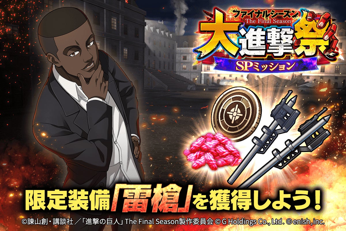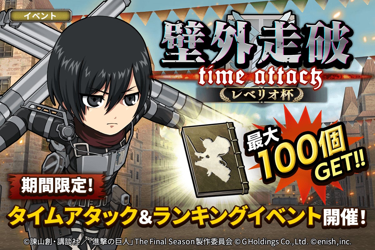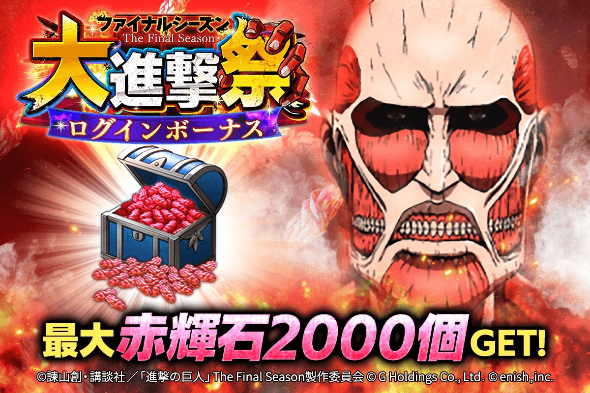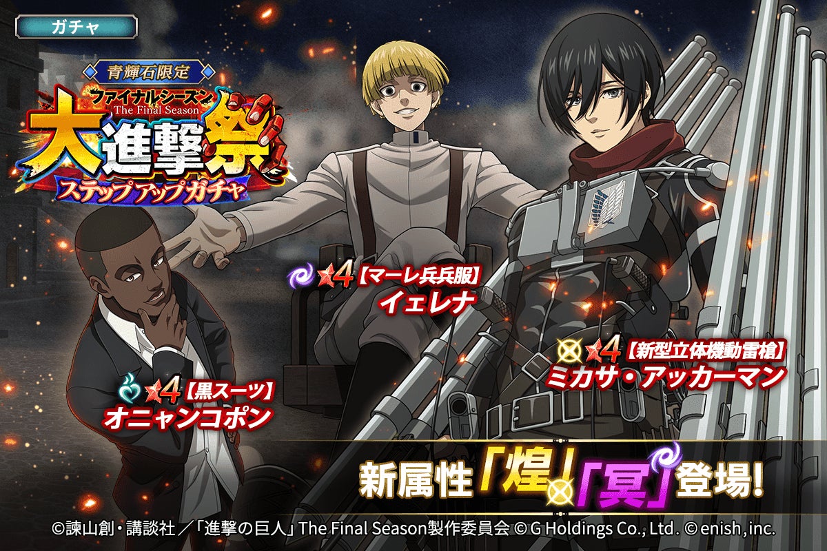 株式会社enish(本社:東京都港区、代表取締役社長:安徳 孝平、以下enish)は、アニメ『進撃の巨人』のスマートフォンゲーム最新作「進撃の巨人Brave Order」にて、2022年11月15日(火)より、アニメ『進撃の巨人』完結編に向け、ブレオダ進撃!ファイナルシーズン大進撃祭を開催!期間中ログインボーナスや限定ミッションなどで赤輝石最大4000個+αがもらえちゃう!更にブレオダ初となるファイナルシーズンのミカサが新属性で登場するガチャも同時開催!その他、最新情報はゲーム公式サイト・ゲーム公式Twitterアカウントにて随時公開して行きますので、ぜひご覧ください。