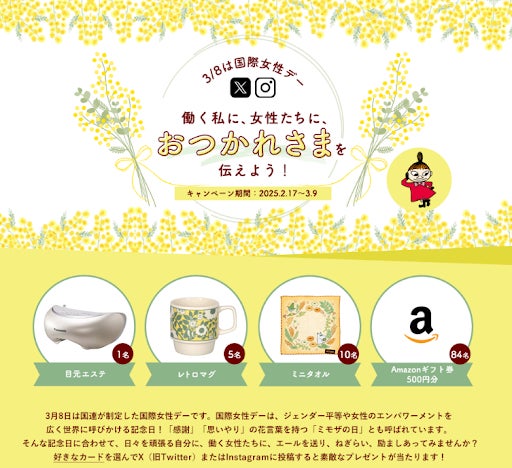株式会社キャリアデザインセンター(本社:東京都港区 代表取締役社長兼会長:多田 弘實)が運営する、正社員で長く働きたい女性のための転職サイト『女の転職type』は、3月8日の国際女性デーにあわせてミモザのカードを送りあうキャンペーンを実施します。カードには「おつかれさま」「ありがとう」などのメッセージごとに6種類のリトルミイがあしらわれ、自分自身や、日々を頑張る女性にねぎらいや励ましのメッセージを送ることができます。X(旧Twitter)またはInstagramに投稿すると抽選で素敵なプレゼントが当たります。ぜひキャンペーンにご参加ください!(https://woman-type.jp/s/campaign38/)